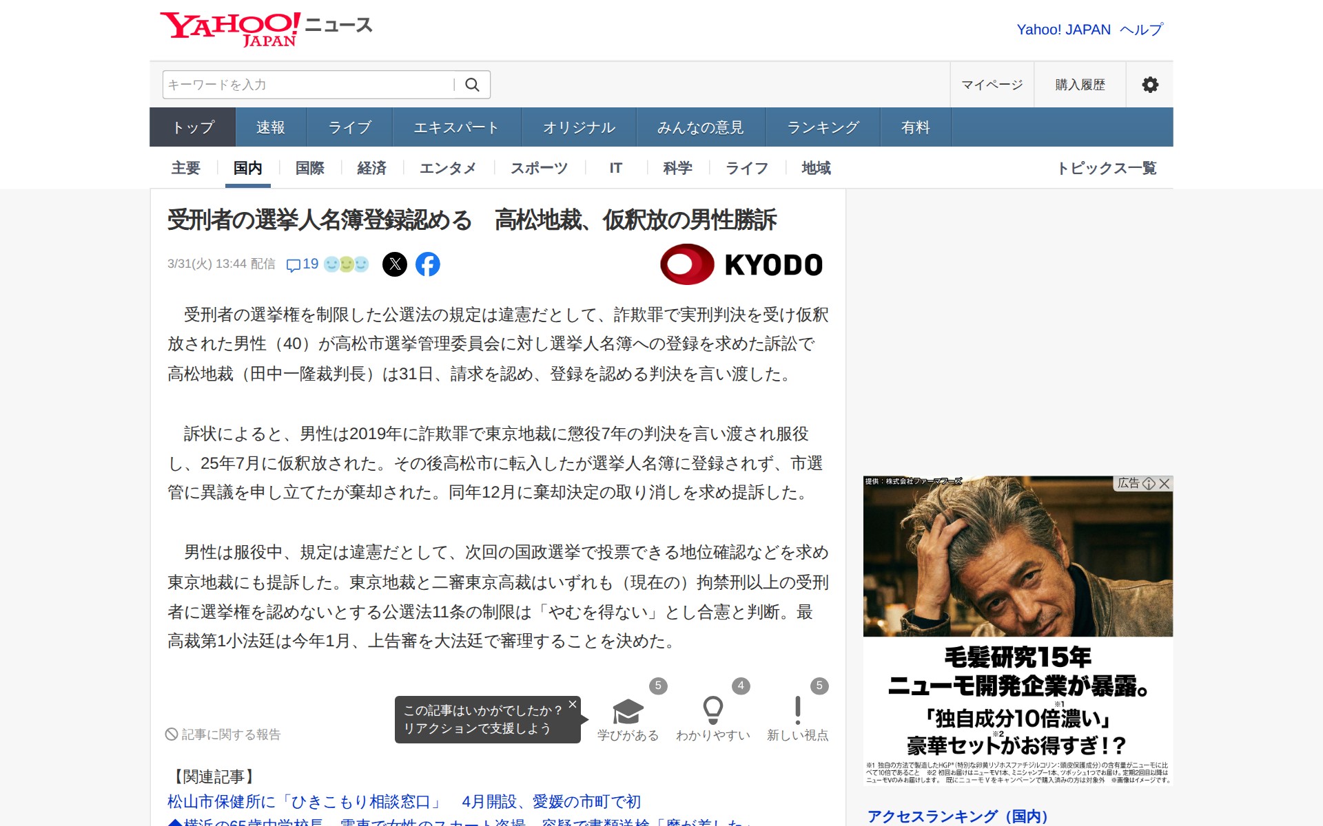 受刑者の選挙人名簿登録認める 高松地裁、仮釈放の男性勝訴(共同通信) - Yahoo!ニュース - 保存されたスクリーンショット
