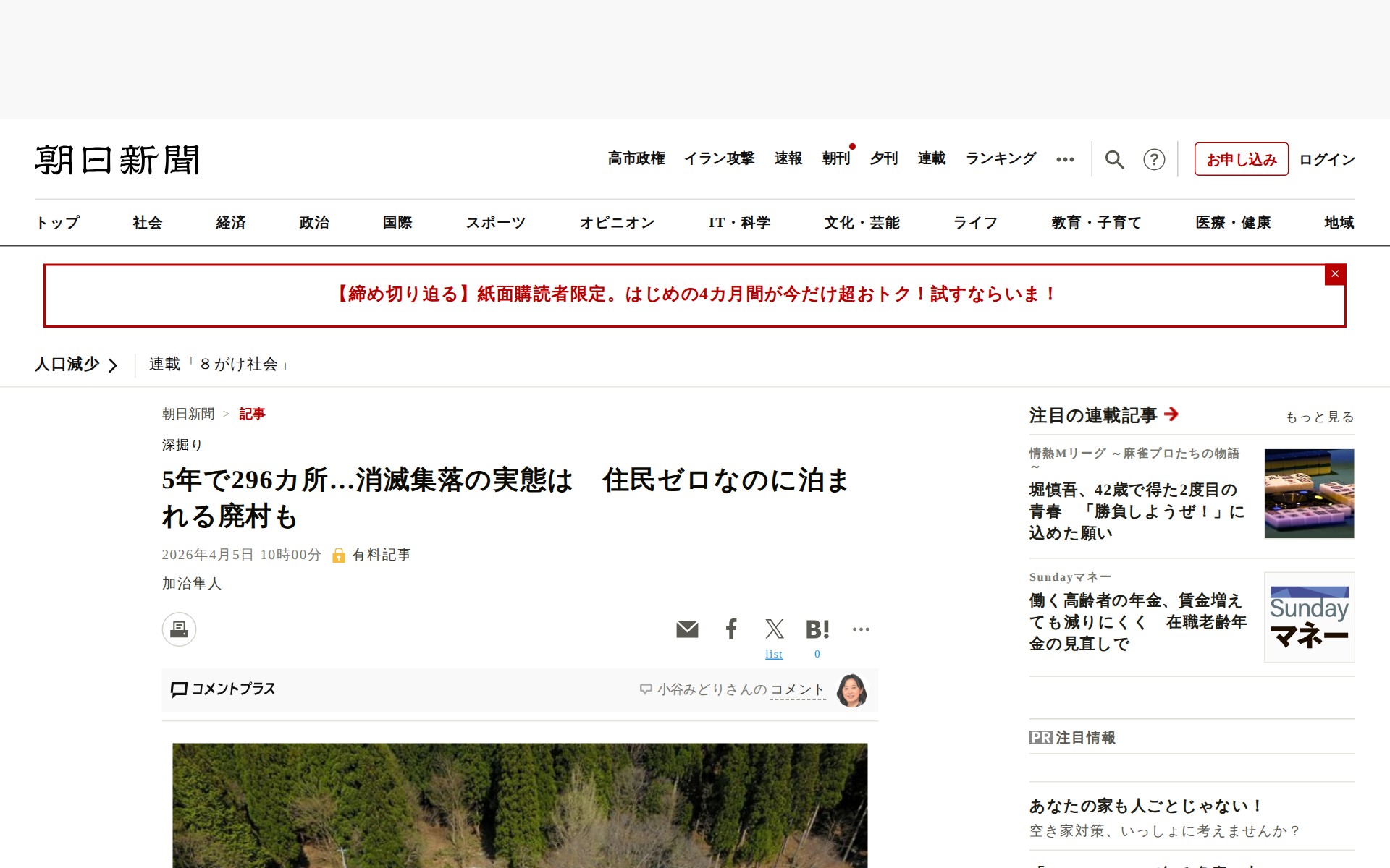 ![5年で296カ所…消滅集落の実態は 住民ゼロなのに泊まれる廃村も [消滅可能性自治体]:朝日新聞 - 保存されたスクリーンショット](https://pub-f6fa8ca7bebe4069bff3224f9a8f5334.r2.dev