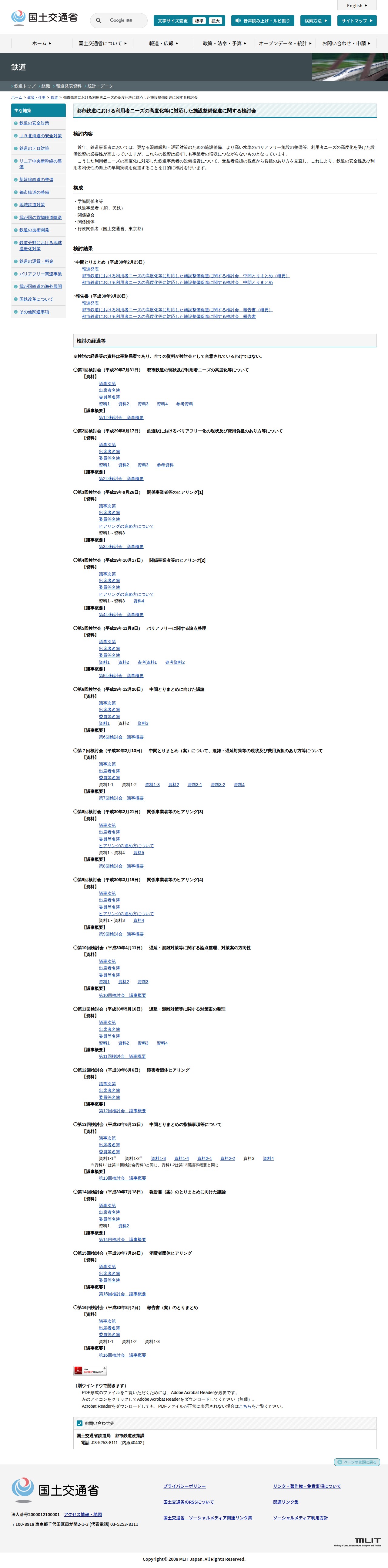 このページは、国土交通省が主催する「都市鉄道における利用者ニーズの高度化等に対応した施設整備促進に関する検討会」の情報を提供しています。鉄道事業者が混雑緩和、遅延対策、バリアフリー施設整備など、利用者ニーズの高度化に対応した設備投資を行っていますが、これらが必ずしも増収につながらないため、受益者負担の観点から負担のあり方を見直し、安全性と利用者利便性の向上を促進することを目的とした検討会です。学識者、鉄道事業者、行政機関が参加し、2017年7月から複数回の検討会を開催し、2018年2月に中間とりまとめ、9月に報告書をまとめました。