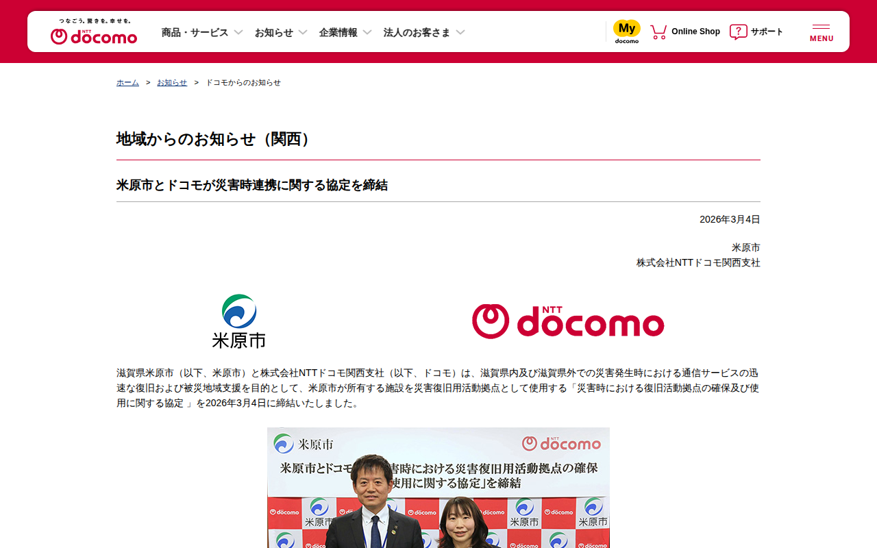 地域からのお知らせ(関西) : 米原市とドコモが災害時連携に関する協定を締結 | お知らせ | NTTドコモ - 保存されたスクリーンショット