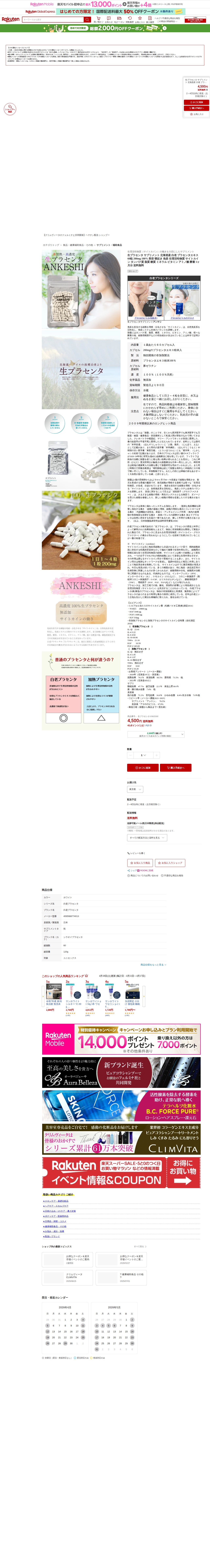 このページは、北海道産白老プラセンタを使用したサプリメント「生プラセンタ アンケシ」の商品紹介ページです。60粒入り、1粒200mgのプラセンタエキス粉末100%で、1ヶ月分、送料無料、4,500円で販売されています。非加熱製法で化学薬品無添加、冷蔵保管が必要です。サイトカインなどの生理活性物質を含み、免疫機能や美容をサポートします。2009年開発のロングヒット商品で、プラセンタの歴史と有効成分について詳しく説明されています。