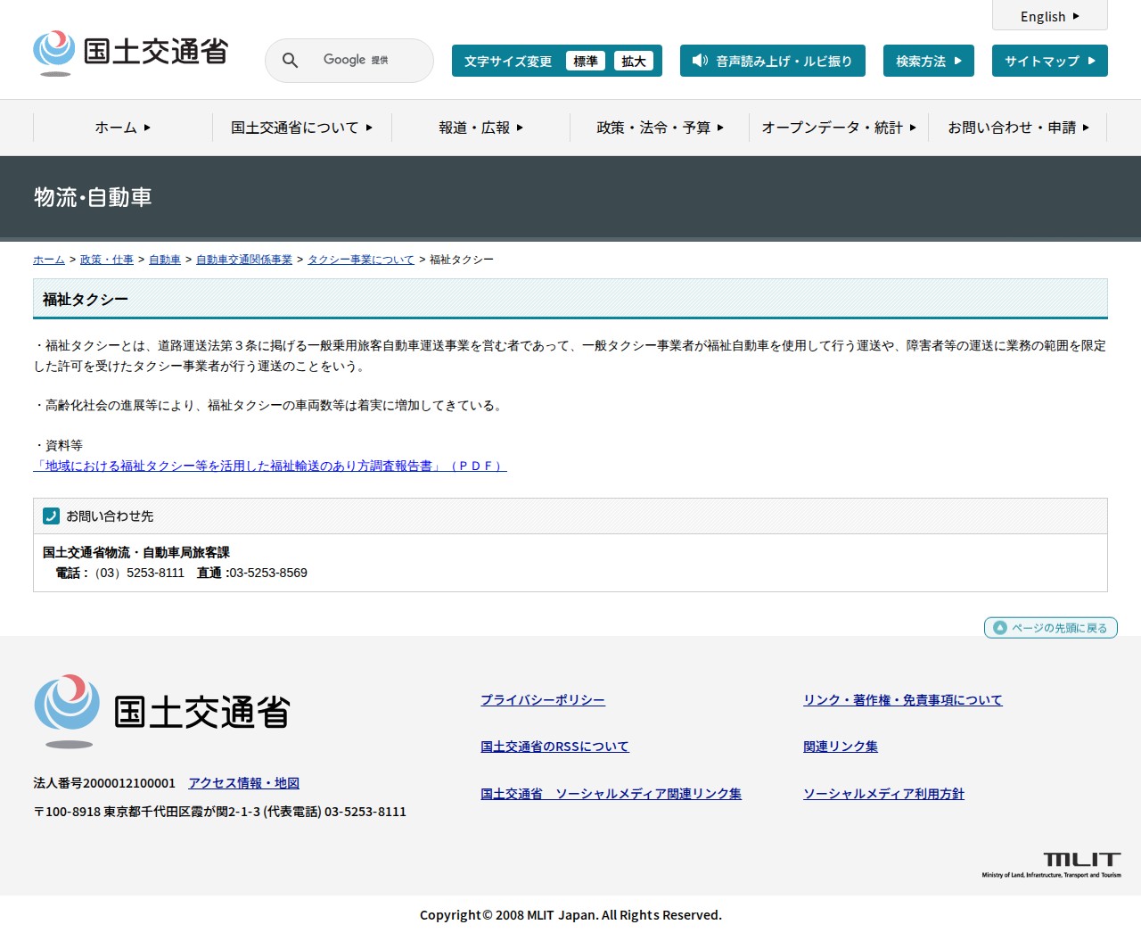 このページは、国土交通省による福祉タクシーについての説明です。福祉タクシーは、道路運送法に基づいて一般タクシー事業者が福祉自動車を使用して行う運送、または障害者等の運送に業務を限定した許可を受けたタクシー事業者による運送を指します。高齢化社会の進展に伴い、福祉タクシーの車両数は着実に増加しています。ページには関連する調査報告書へのリンクが掲載されており、国土交通省物流・自動車局旅客課への問い合わせ先も記載されています。