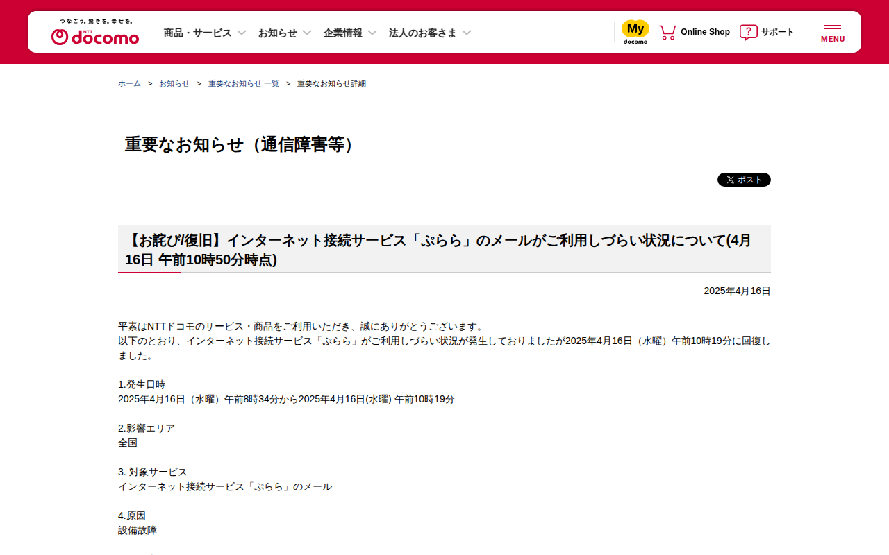 重要なお知らせ(通信障害等) : 【お詫び/復旧】インターネット接続サービス「ぷらら」のメールがご利用しづらい状況について(4月16日 午前10時50分時点) | お知らせ | NTTドコモ - 保存されたスクリーンショット