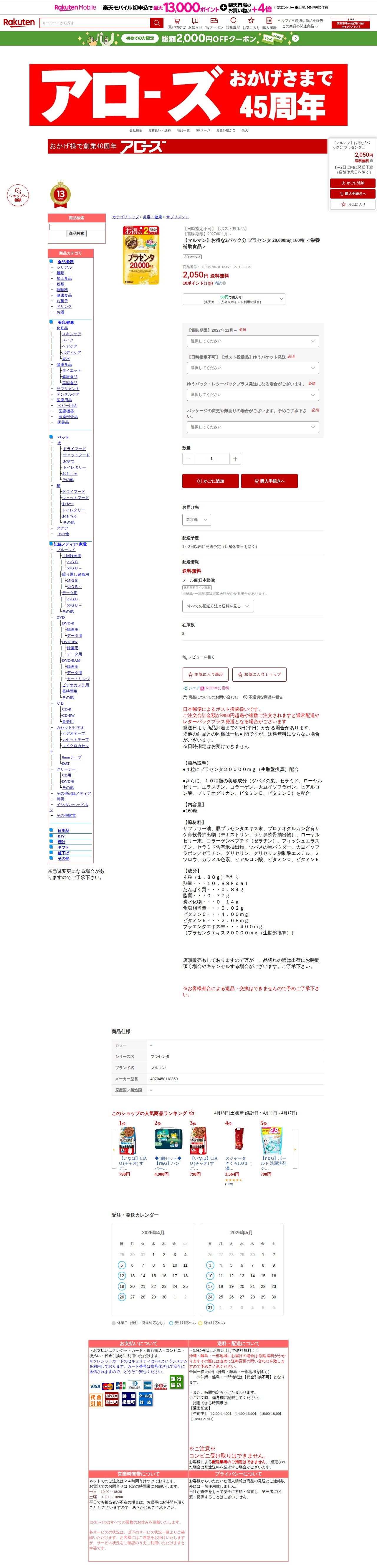 【楽天市場】【マルマン】お得な2パック分 プラセンタ 20,000mg 160粒 <栄養補助食品>:アローズ楽天市場店