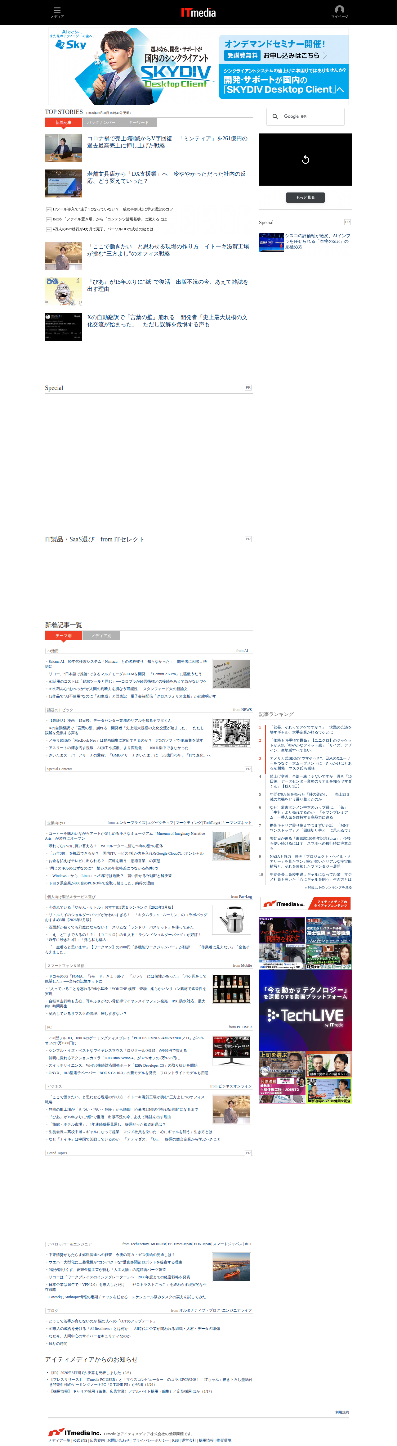 このページはITmedia(IT総合情報ポータル)のホームページです。AI活用、企業向けIT、スマートフォン、PCなど複数のテーマにおいて、最新のIT関連ニュースと記事を提供しています。コロナからのV字回復事例、DX支援、AI技術開発、X翻訳機能など話題のトピックを紹介。さらに個人向け製品やサービス選びの情報も掲載しており、IT業界の専門知識から日常生活に役立つ製品情報まで、幅広い読者層を対象とした総合的なIT情報サイトです。