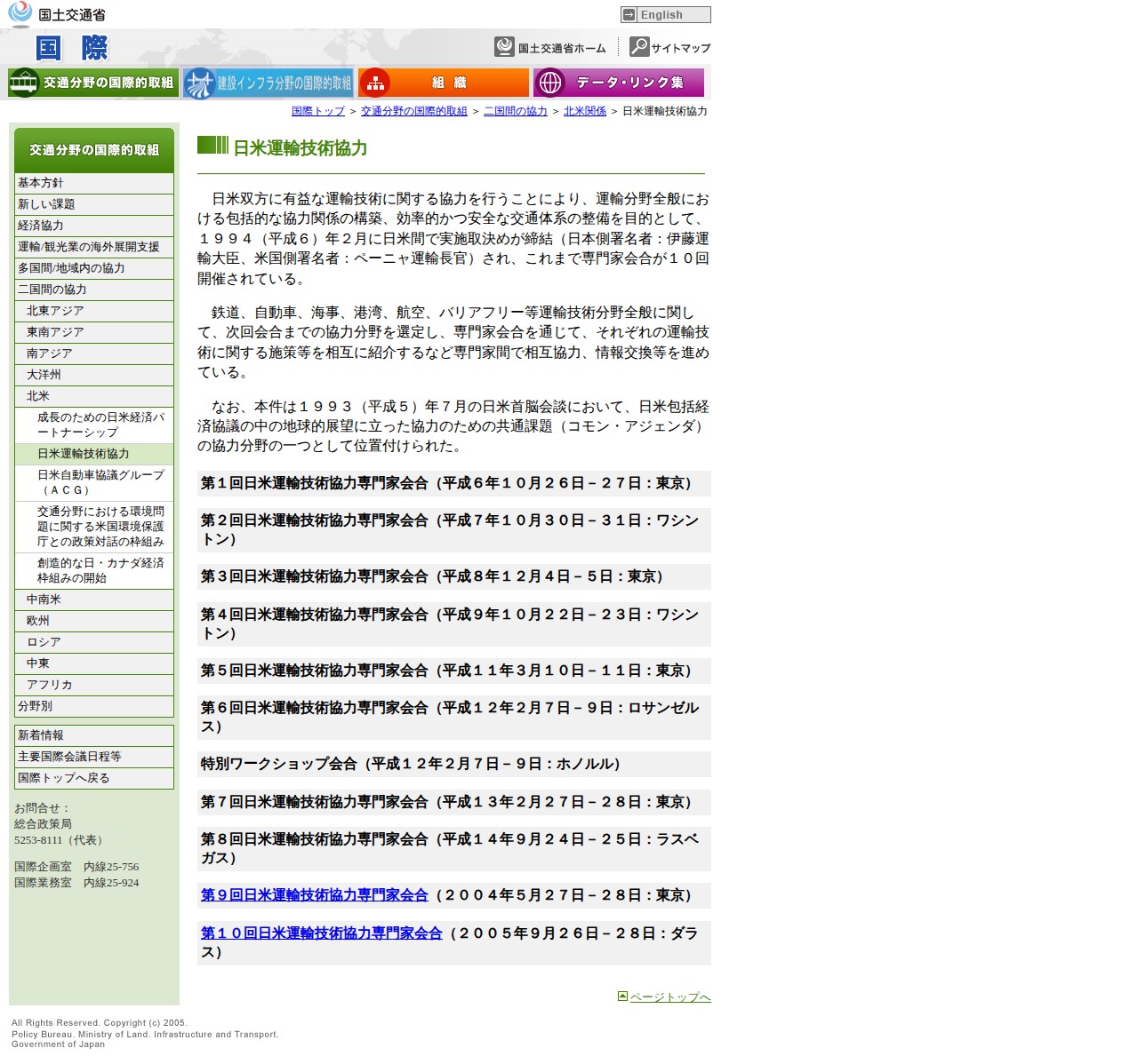 このページは、日米間の運輸技術協力について説明しています。1994年2月に締結された日米運輸技術協力実施取決めに基づき、鉄道、自動車、海事、港湾、航空、バリアフリーなど運輸技術全般における協力を推進しています。専門家会合を通じて、両国の運輸技術に関する施策の相互紹介や情報交換を行っており、2005年までに10回の会合が開催されました。本協力は1993年の日米首脳会談で、日米包括経済協議の共通課題として位置付けられたものです。