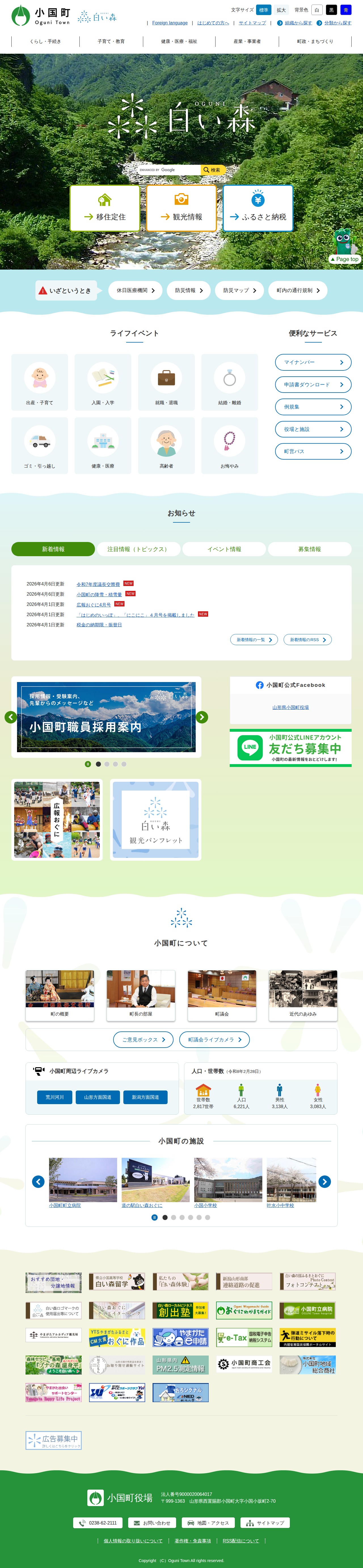 このページは山形県小国町の公式ホームページのトップページです。移住定住、観光情報、ふるさと納税などの各種情報が提供されています。くらし・手続き、子育て・教育、健康・医療・福祉など生活に関する情報カテゴリが用意されています。新着情報では議長交際費や降雪量、広報誌など最新の町政情報が掲載されています。人口は6,221人、世帯数2,817世帯です。小国町役場の住所は山形県西置賜郡小国町です。