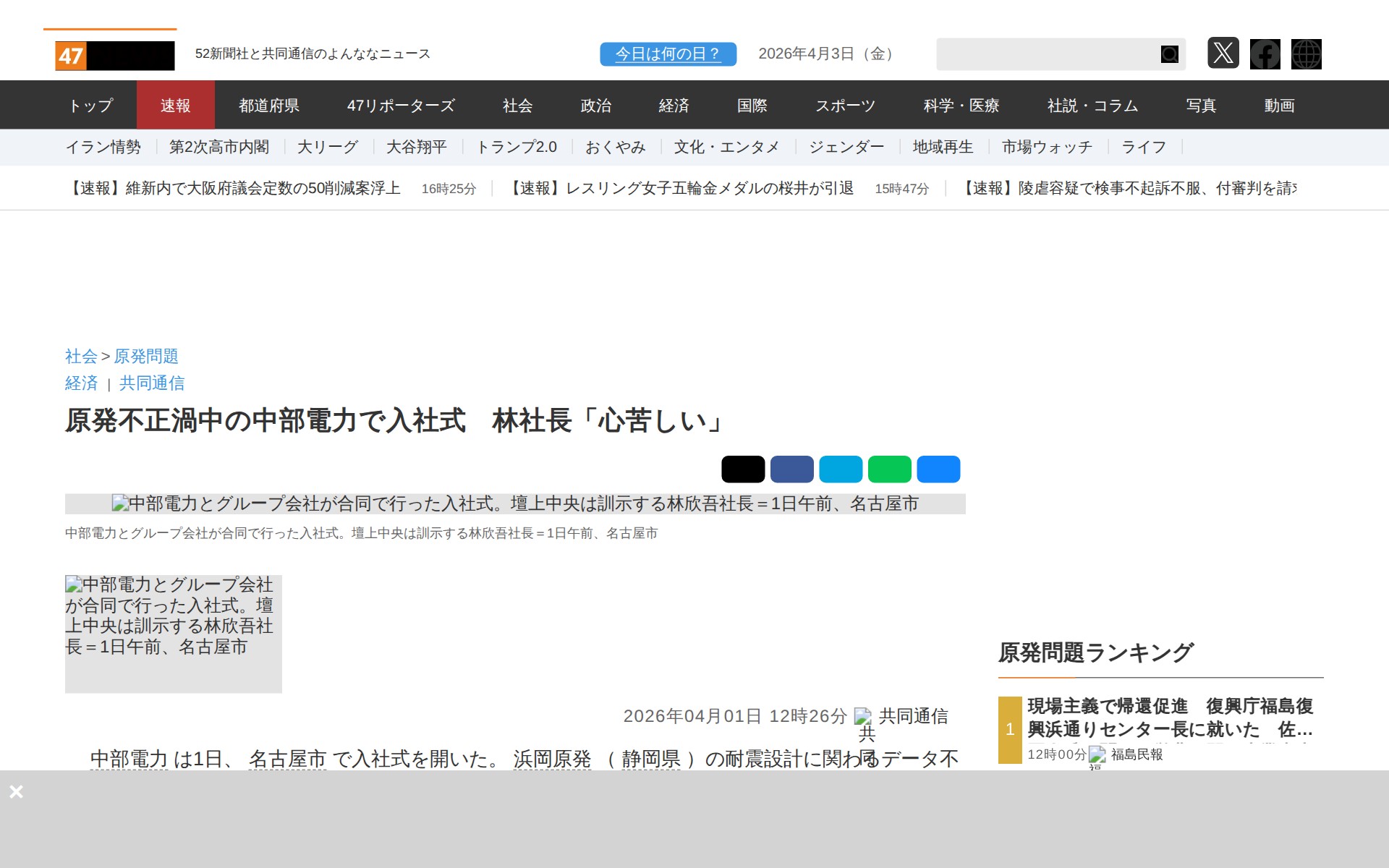 このページは、中部電力が2026年4月1日に名古屋市で開催した入社式について報じたニュース記事である。浜岡原発の耐震設計データ不正問題の渦中で行われた式典で、林欣吾社長は新入社員に不安を与えていることへの心苦しさを述べた。社長はデータ不正について謝罪し、再発防止に取り組むことを説明。中部電力傘下の送配電会社と販売会社との合同式に約520人が出席。中部電は前日に原子力規制委員会と経済産業省へ報告書を提出していた。