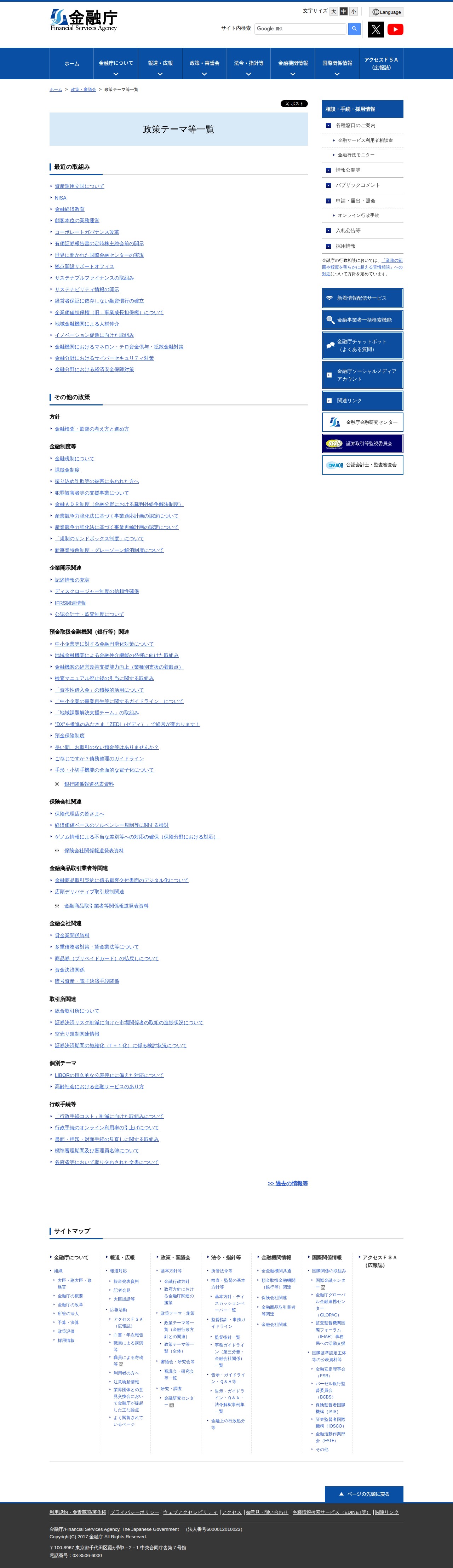 このページは、金融庁の政策テーマと施策を一覧で示したものです。資産運用立国、NISA、金融経済教育などの最近の取組みから、金融検査・監督の方針、金融制度、企業開示、預金取扱金融機関、保険会社、金融商品取引業者など各業態別の関連情報まで、幅広い政策テーマを網羅しています。また、行政手続のオンライン化、相談窓口案内、採用情報といった利用者向けのサービスも掲載されており、金融行政に関する総合的な情報ポータルとなっています。