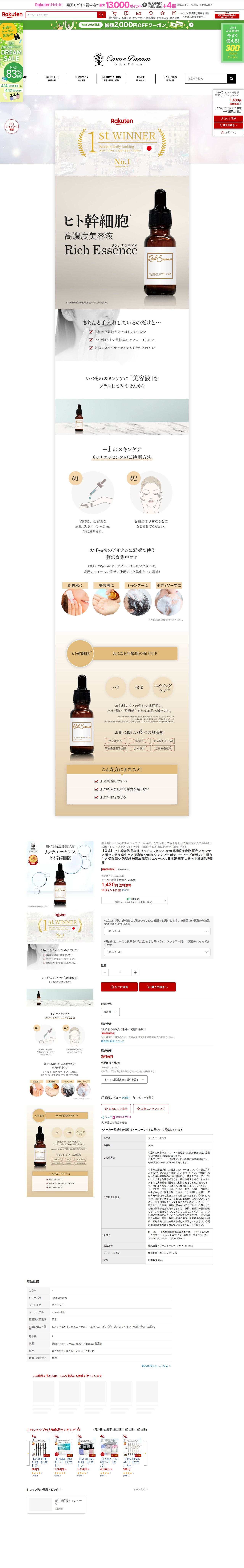このページは、楽天市場で販売されているヒト幹細胞美容液「リッチエッセンス」の商品ページです。20mlのスポイトタイプで、メーカー希望小売価格2,200円が1,430円で販売されており、送料無料です。高濃度の原液で、化粧水に混ぜたり集中ケアとして使用できます。ヒト脂肪細胞培養液エキスを含む無添加の日本製で、乾燥やハリ、キメなどの肌悩みに対応。楽天1位の人気商品で、翌日配送に対応しています。