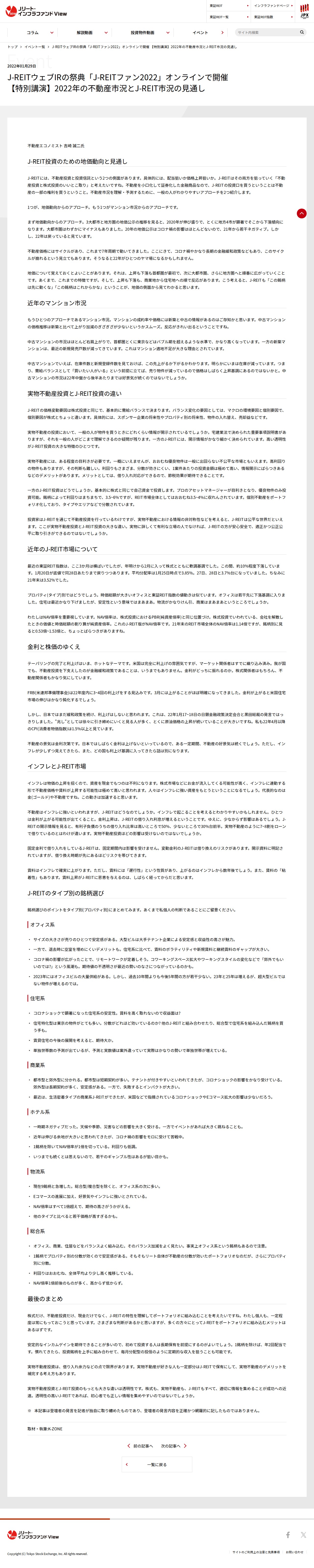 J-REITウェブIRの祭典「J-REITファン2022」オンラインで開催【特別講演】2022年の不動産市況とJ-REIT市況の見通し | Jリート・インフラファンドview 東京証券取引所