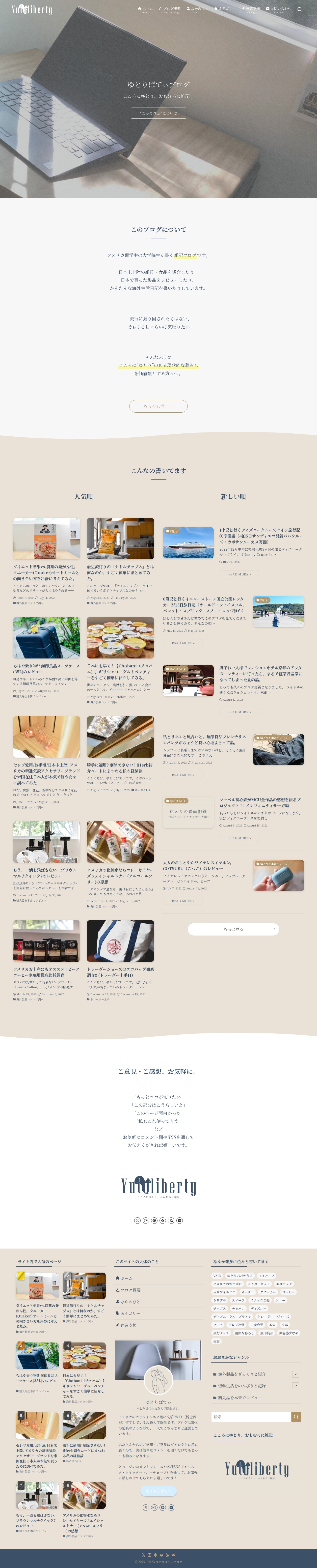 このページは、アメリカ留学中の大学院生が運営する雑記ブログです。日本未上陸の海外製品紹介、購入品レビュー、海外生活日記などを掲載しています。流行に左右されず、心にゆとりのある現代的な暮らしを価値観とする読者を対象としています。クエーカーオートミール、ケトルチップス、ギリシャヨーグルト、アメリカのアクセサリーブランド、化粧水、コーヒーなど、様々な海外製品について詳しく調べた記事が特徴です。旅行記やスキンケア情報も充実しており、読者に実用的で丁寧な情報提供を心がけています。
