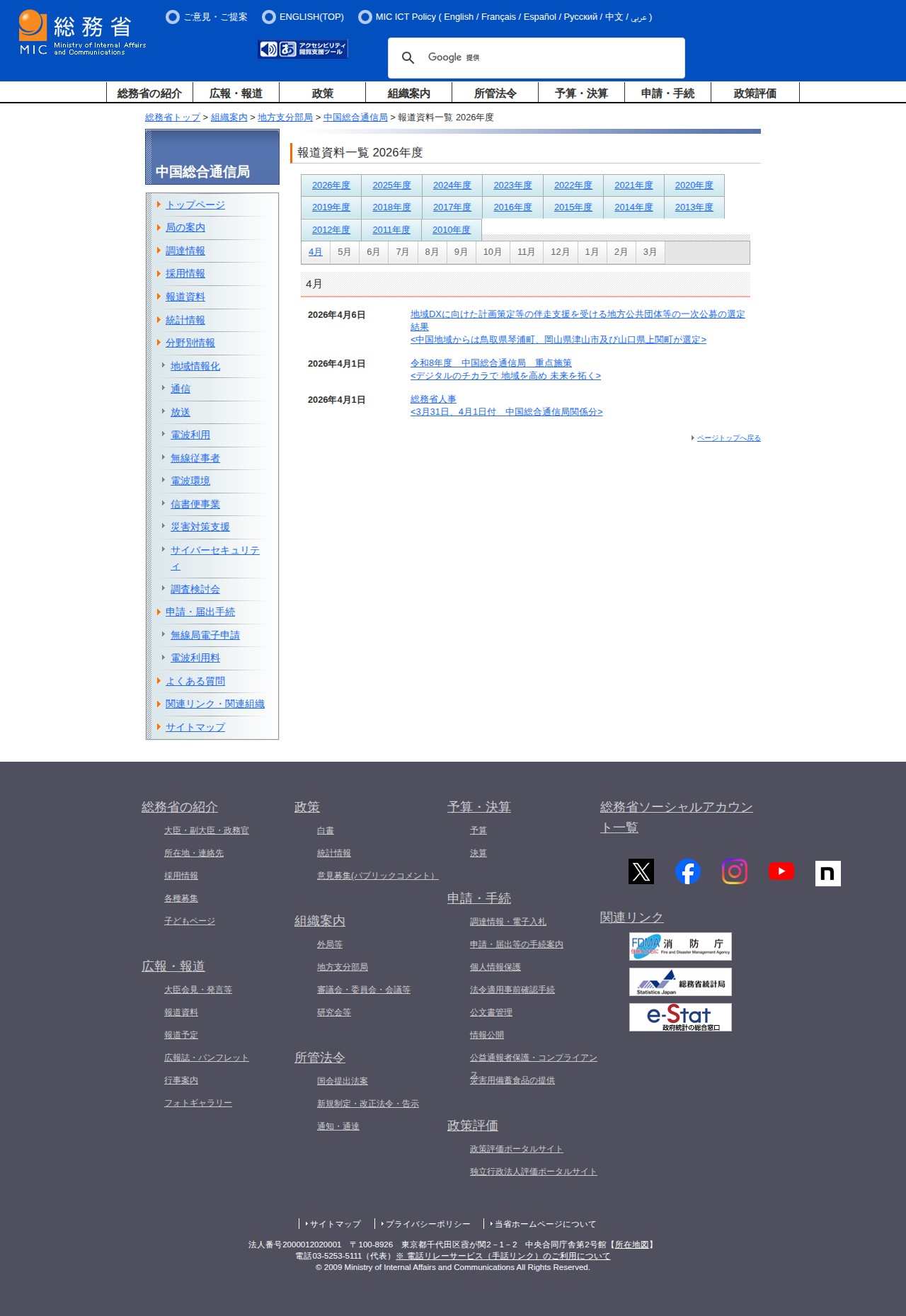 総務省|中国総合通信局|報道資料一覧 2026年度