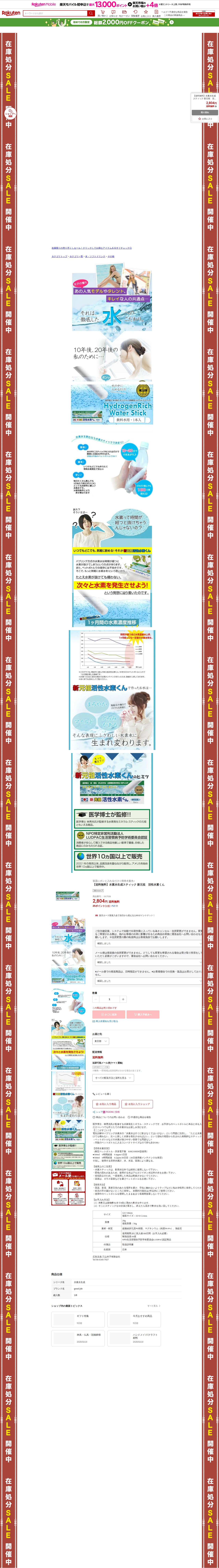 このページは、楽天市場で販売されている「水素水生成スティック 新元祖 活性水素くん」の商品ページです。価格は2,804円で送料無料。医学博士・林秀光氏監修のミネラルスティックで、ペットボトルに本品と水を入れるだけで水素水が生成できます。電気分解式と異なり、水素が抜けても継続的に発生させる方式を採用。500mlで6時間後に0.4ppmの溶存水素濃度を実現。コンパクト設計で携帯可能。使用期間は180日間で、定期的なメンテナンスが必要。生産国は日本。
