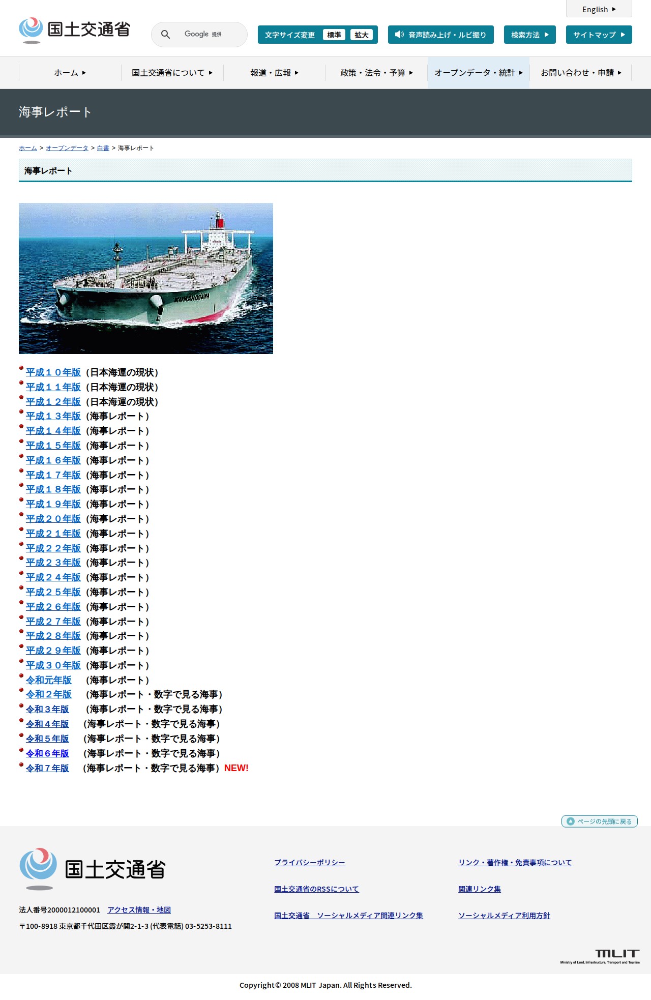 このページは、国土交通省が公開している海事レポートのアーカイブです。日本の海運業に関する統計情報や現状分析をまとめた報告書が、平成10年版から令和7年版まで年次ごとにリスト化されています。平成12年までは「日本海運の現状」というタイトルで、平成13年以降は「海事レポート」として発行されており、令和2年版からは「数字で見る海事」も併せて提供されています。これらの資料は国土交通省のオープンデータ・統計セクションで管理されています。