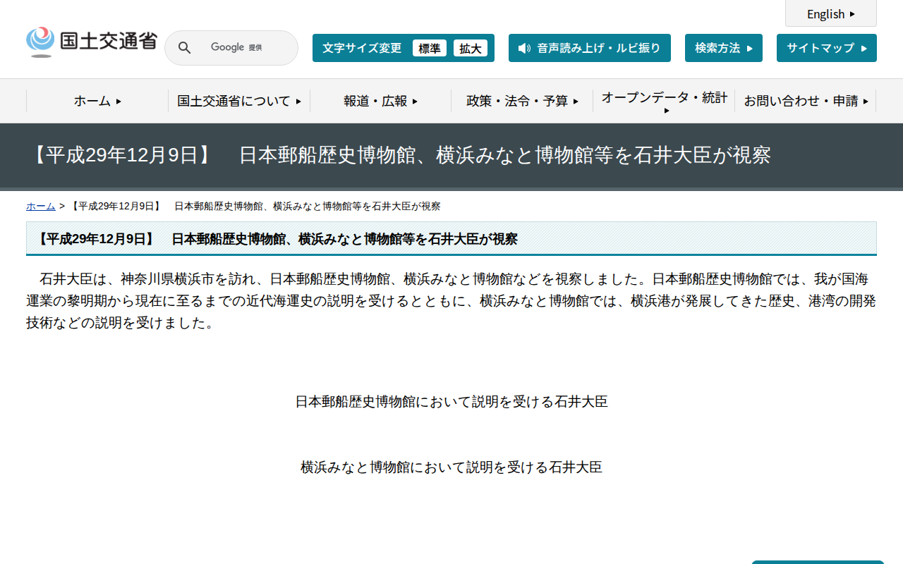 【平成29年12月9日】 日本郵船歴史博物館、横浜みなと博物館等を石井大臣が視察 - 国土交通省