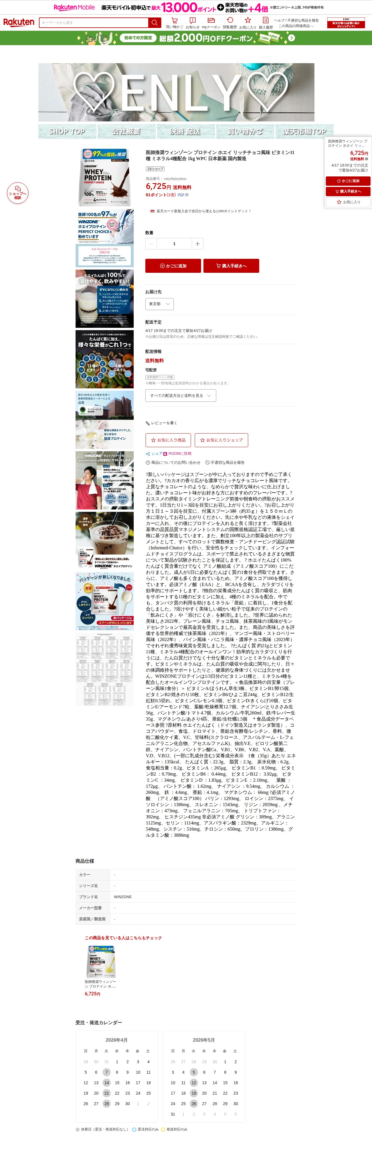 このページは、楽天市場で販売されている医師推奨の「ウィンゾーン プロテイン ホエイ リッチチョコ風味」の商品ページです。1kg入りで価格は6,725円、送料無料です。日本新薬製造の国内産で、ホエイプロテイン100%、1食分約35gで約21gのたんぱく質を含有しています。ビタミン11種とミネラル4種を配合し、アミノ酸スコア100を達成。製薬会社基準の厳しい品質管理と、アンチドーピング認証試験を実施しています。世界的な味覚賞やモンドセレクション最高金賞を受賞した美味しさが特徴です。