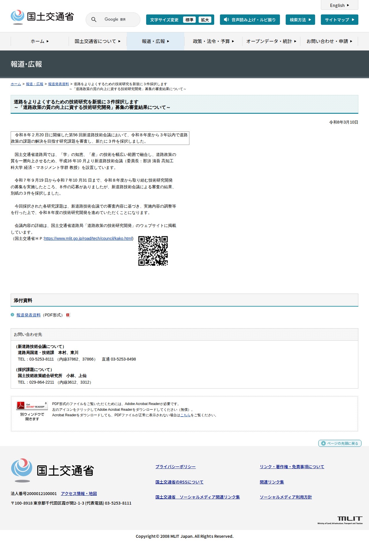 報道発表資料:道路をよりよくするための技術研究を新規に3件採択します<br>~「道路政策の質の向上に資する技術研究開発」募集の審査結果について~ - 国土交通省 - 保存されたスクリーンショット