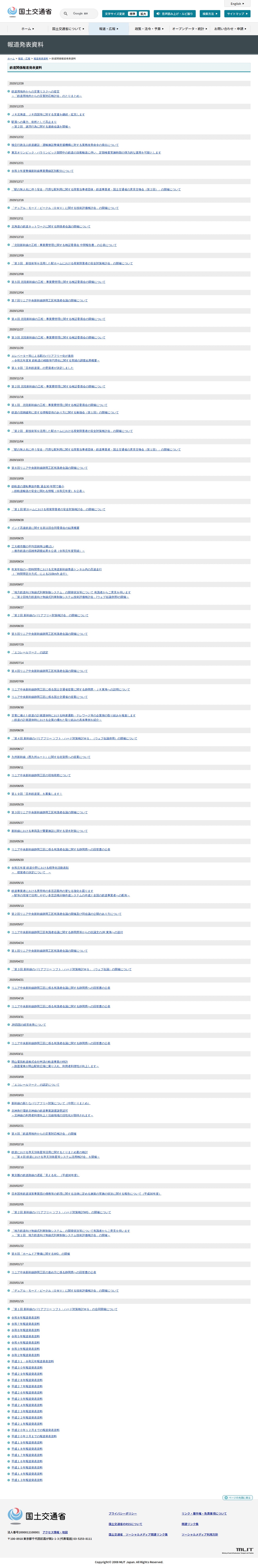 このページは、国土交通省による2020年の鉄道関係報道発表資料をまとめたものです。鉄道用地外からの災害対策、JR北海道・JR四国への支援、駅員への暴力対策、新幹線事業費配分、駅のバリアフリー化、視覚障害者の安全対策、リニア中央新幹線、北陸新幹線の工程管理など、多岐にわたる鉄道関連の政策・取組について、日付順に発表資料を列挙しています。