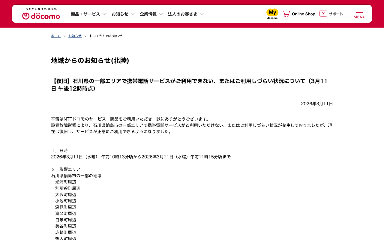 地域からのお知らせ(北陸) : 【復旧】石川県の一部エリアで携帯電話サービスがご利用できない、またはご利用しづらい状況について(3月11日 午後12時時点) | お知らせ | NTTドコモ