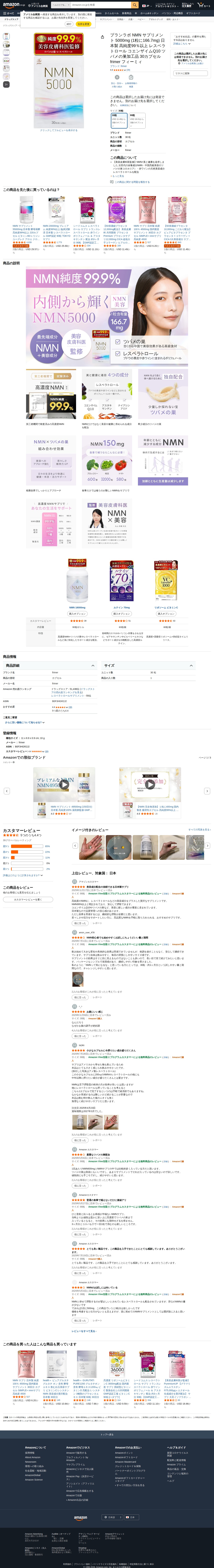 このページはAmazonで販売されているプランラボのNMNサプリメント商品です。1粒あたり166.7mg含有、30カプセル入りで、日本製・高純度99%以上です。NMN、ツバメの巣、レスベラトロール、コエンザイムQ10を配合した美容・健康サプリメントです。美容皮膚科医監修で、星4.4の評価を得ています。価格はUSD 11.49からで、30粒と90粒のサイズ選択肢があります。