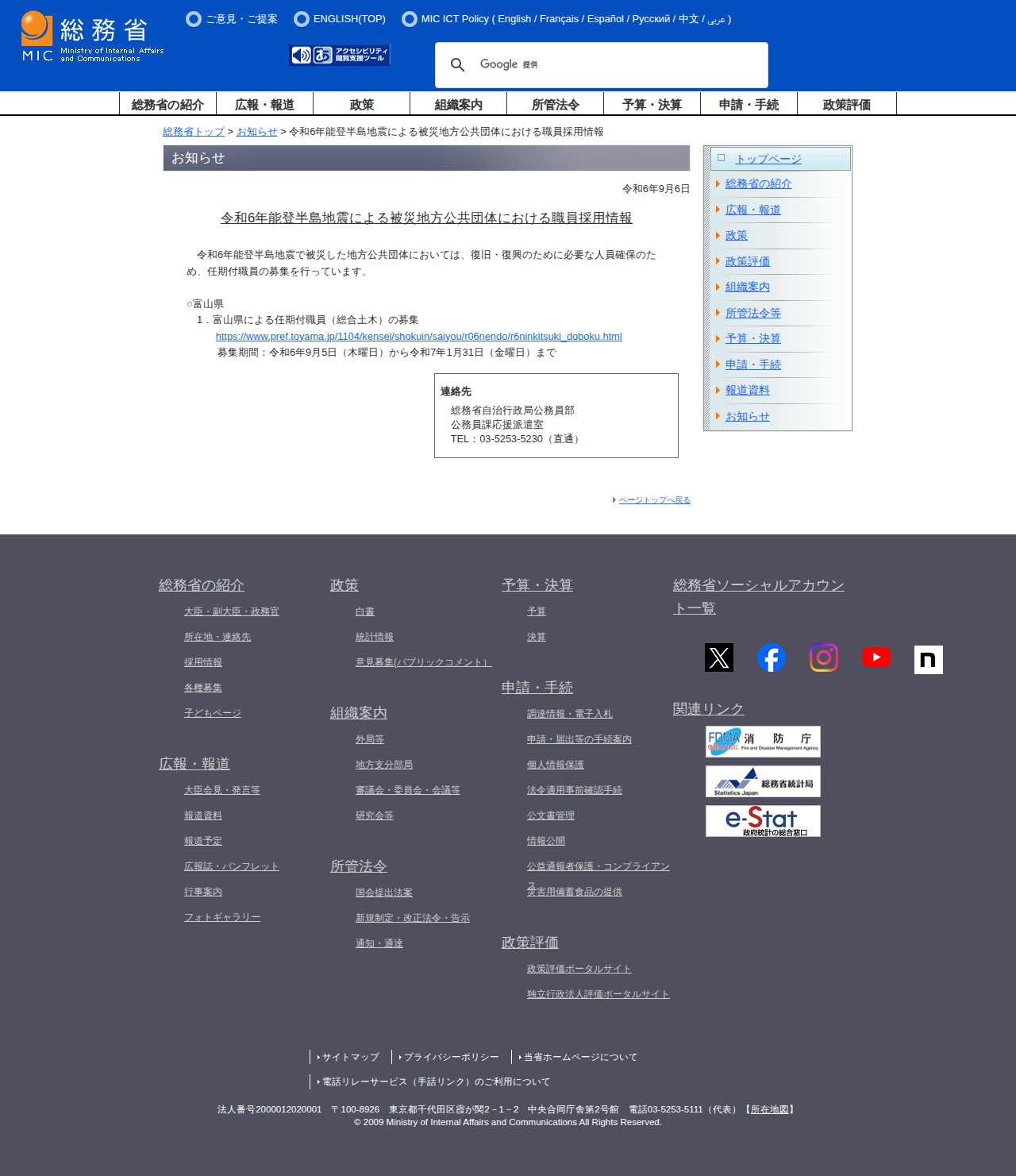 総務省|令和6年能登半島地震による被災地方公共団体における職員採用情報