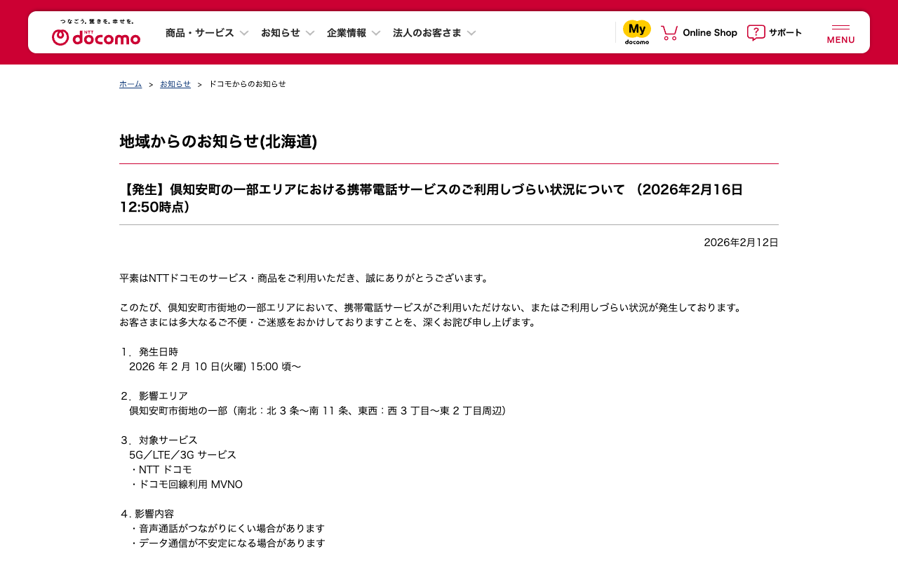 地域からのお知らせ(北海道) : 【発生】倶知安町の一部エリアにおける携帯電話サービスのご利用しづらい状況について (2026年2月16日 12:50時点) | お知らせ | NTTドコモ