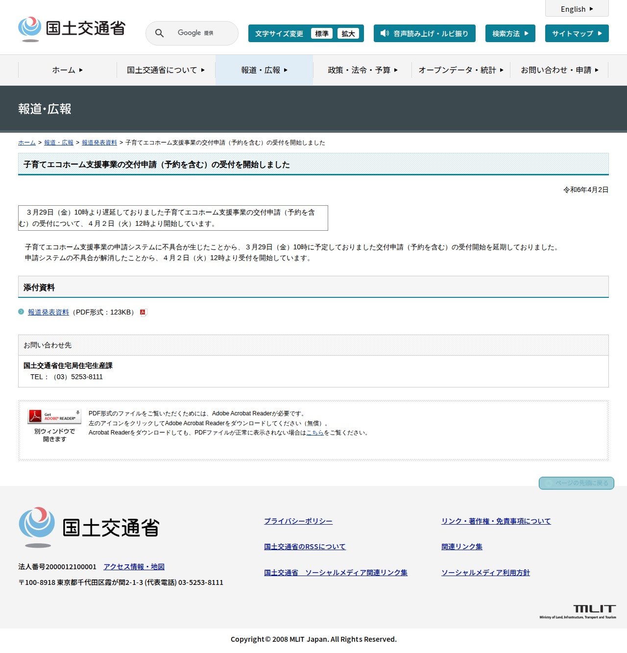 報道発表資料:子育てエコホーム支援事業の交付申請(予約を含む)の受付を開始しました - 国土交通省 - 保存されたスクリーンショット
