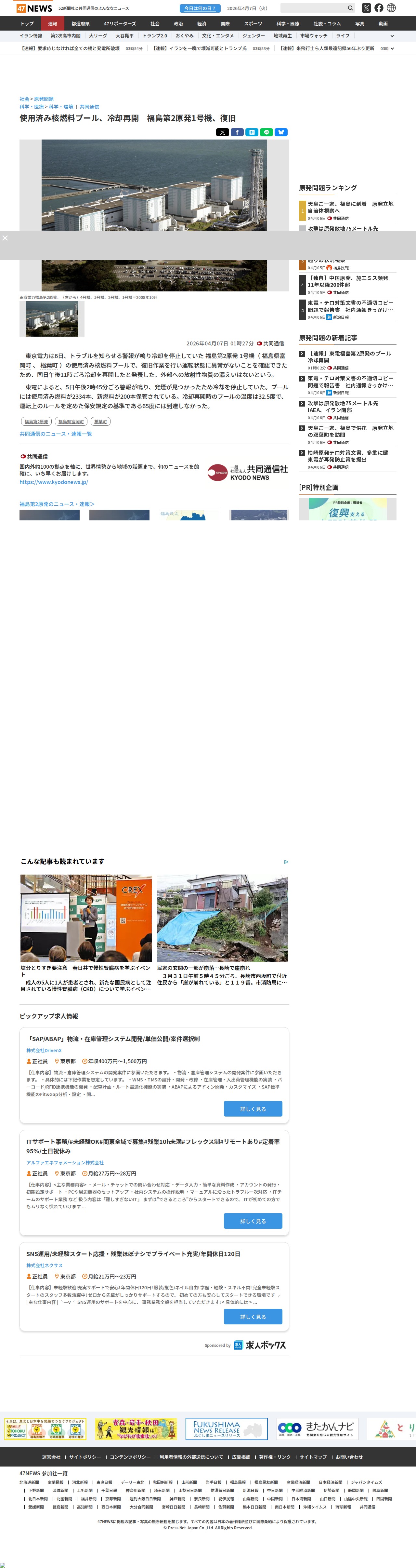 使用済み核燃料プール、冷却再開 福島第2原発1号機、復旧|47NEWS(よんななニュース) - 保存されたスクリーンショット