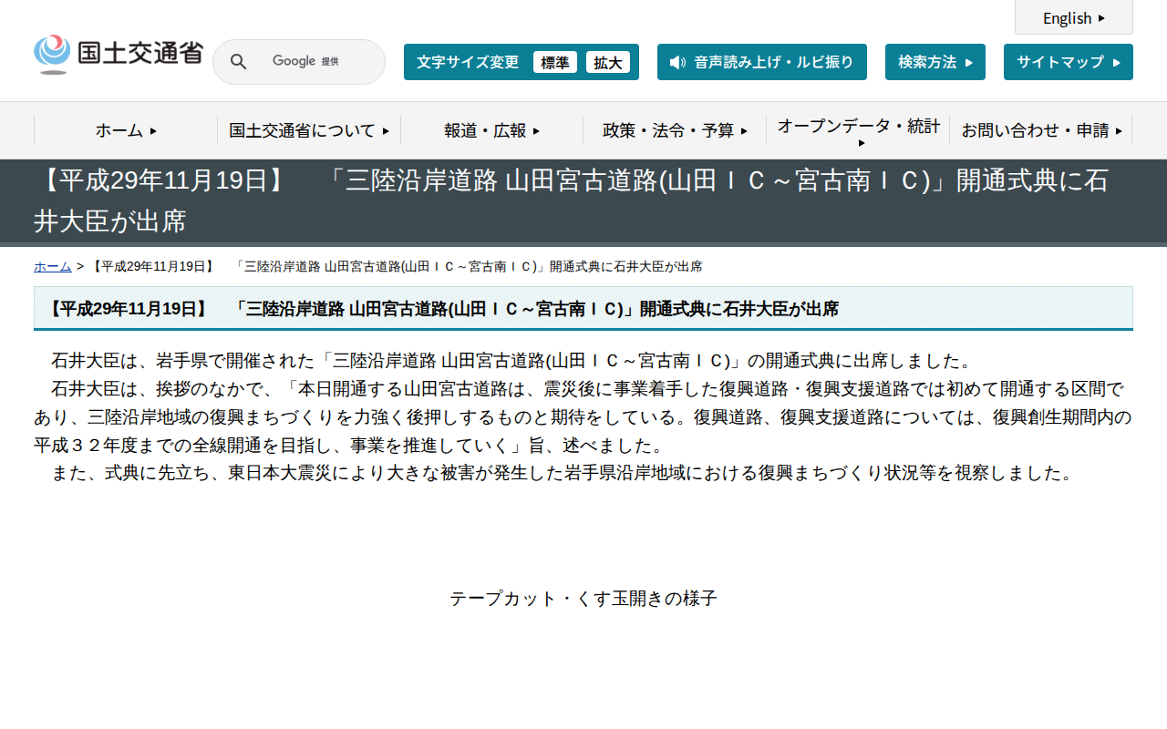 【平成29年11月19日】 「三陸沿岸道路 山田宮古道路(山田IC~宮古南IC)」開通式典に石井大臣が出席 - 国土交通省 - 保存されたスクリーンショット