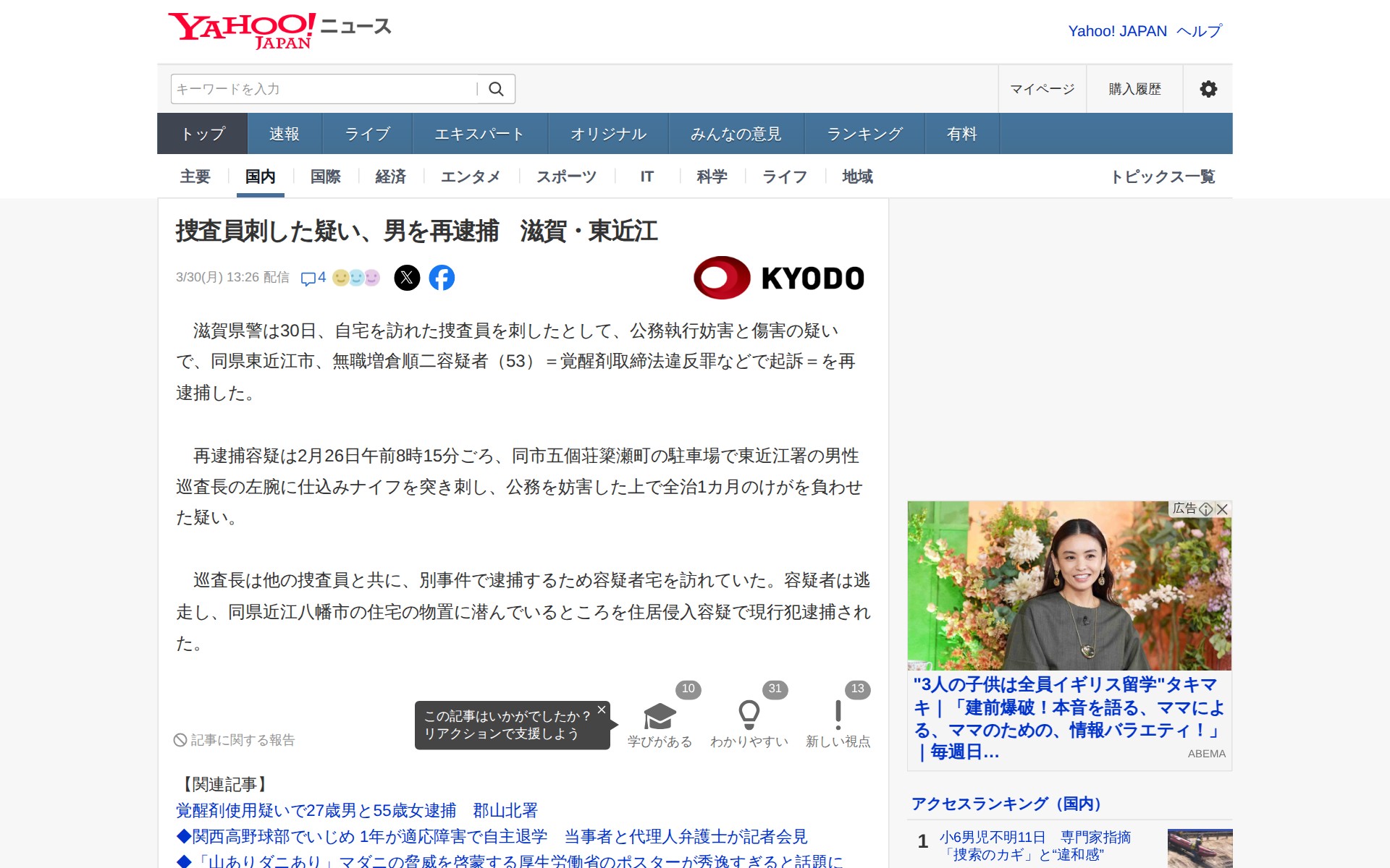 捜査員刺した疑い、男を再逮捕 滋賀・東近江(共同通信) - Yahoo!ニュース