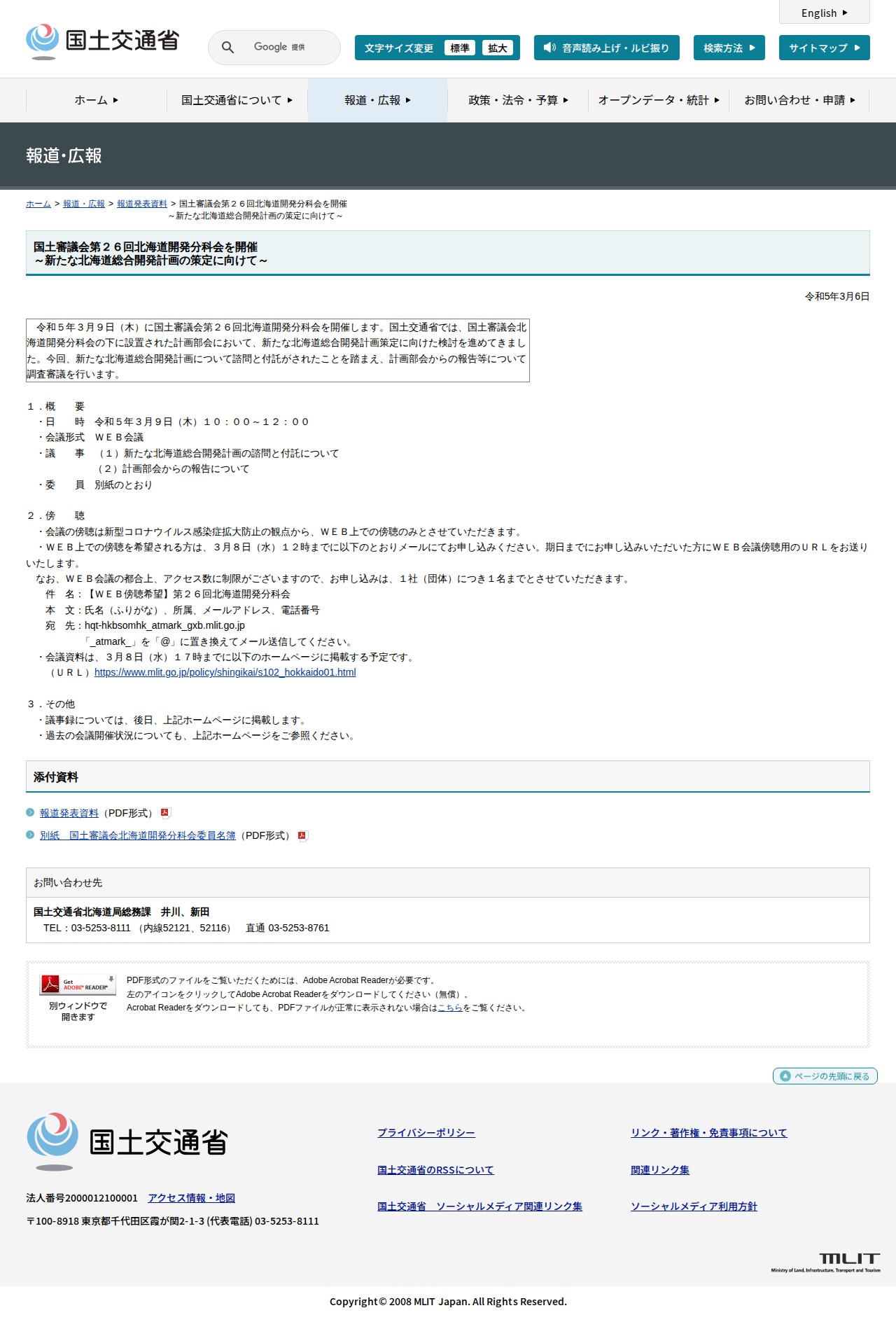 報道発表資料:国土審議会第26回北海道開発分科会を開催<br>~新たな北海道総合開発計画の策定に向けて~ - 国土交通省 - 保存されたスクリーンショット