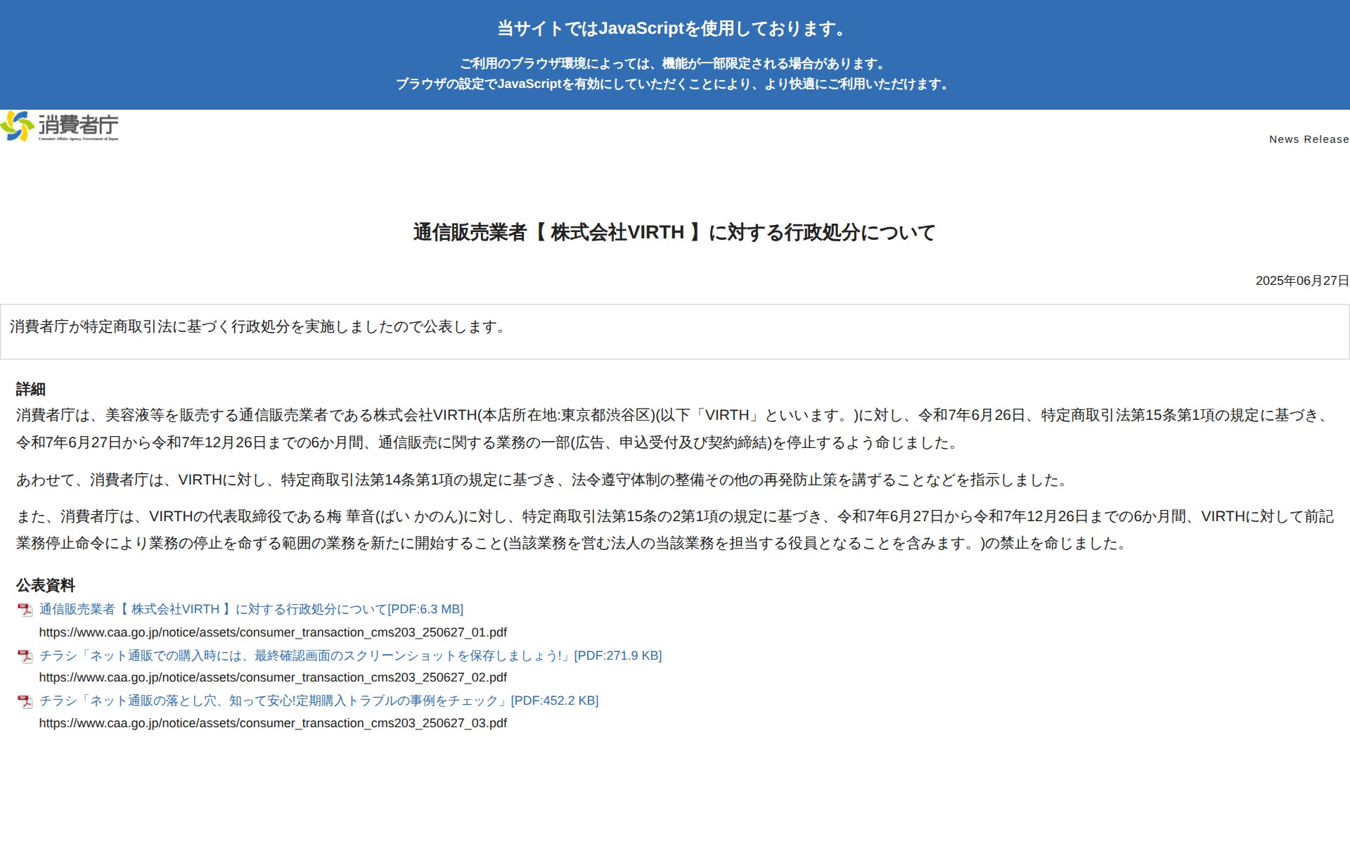 このページは、消費者庁が特定商取引法に基づき、美容液等を販売する通信販売業者の株式会社VIRTHに対して実施した行政処分について公表しています。同社は2025年6月27日から12月26日までの6か月間、広告・申込受付・契約締結の業務停止を命じられました。同時に法令遵守体制の整備等の再発防止策が指示されています。また、代表取締役の梅華音氏も同期間、同様の業務禁止命令を受けています。