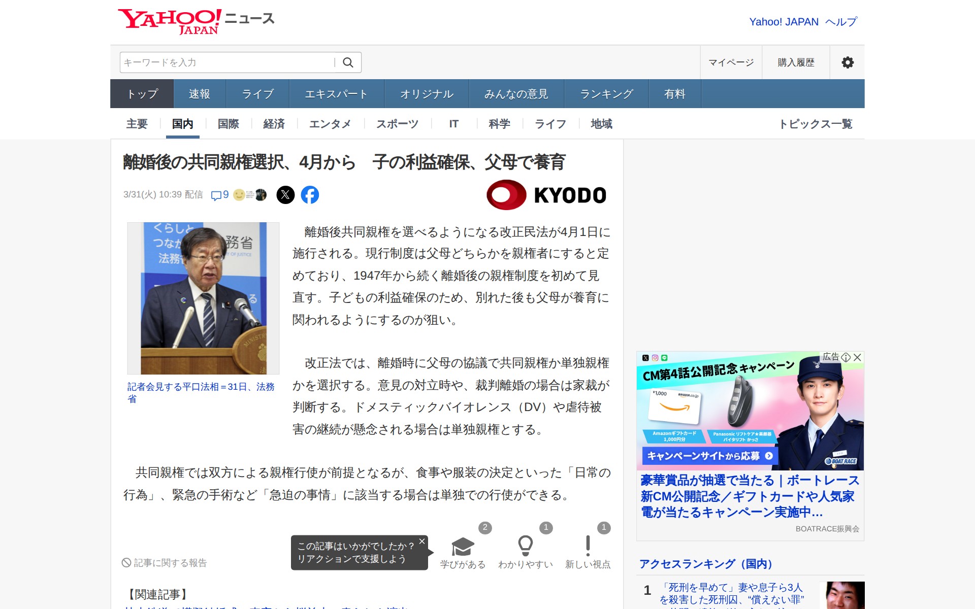 離婚後の共同親権選択、4月から 子の利益確保、父母で養育(共同通信) - Yahoo!ニュース