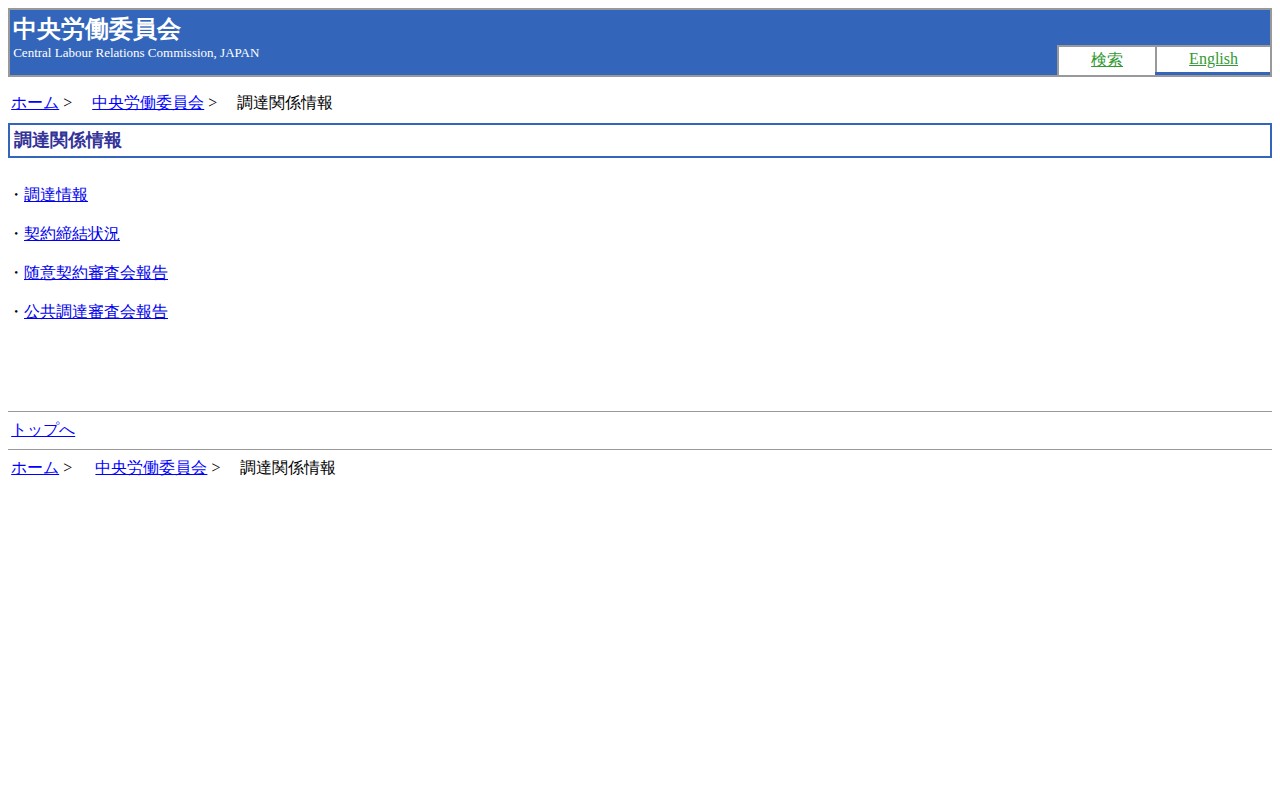 このページは、中央労働委員会の調達関係情報をまとめたポータルページである。調達情報、契約締結状況、随意契約審査会報告、公共調達審査会報告といった4つの主要な調達関連情報へのリンクが提供されている。中央労働委員会が実施する公共調達に関する透明性を確保し、情報公開を行うためのページとなっている。