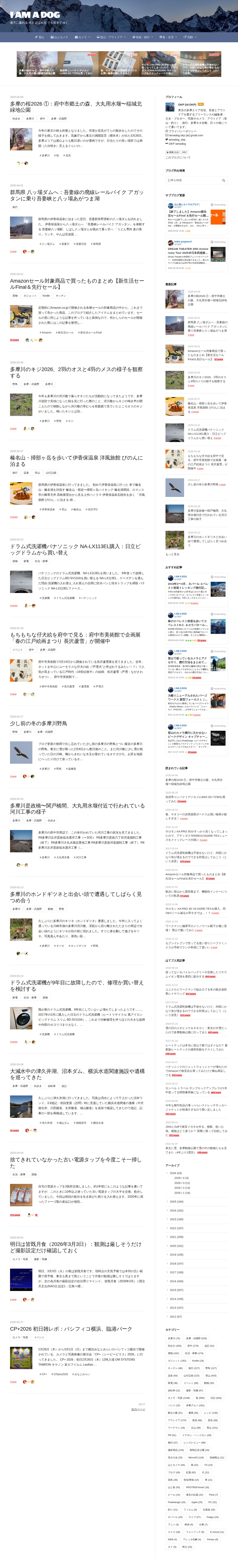 このページは「I AM A DOG」というタイトルのブログサイトです。登山、カメラ、野鳥観察、旅行などを扱い、多摩川周辺の桜や野鳥、群馬県の八ッ場ダムや伊香保温泉、家電製品の購入記など多様なコンテンツを掲載しています。最新記事は多摩の桜2026、八ッ場ダムへのレールバイク体験、Amazonセール対象商品、多摩川のキジ観察、榛名山ハイキング、ドラム式洗濯機の購入、長沢蘆雪展観賞など、日常の体験や趣味の記録をブログ形式で発信しています。
