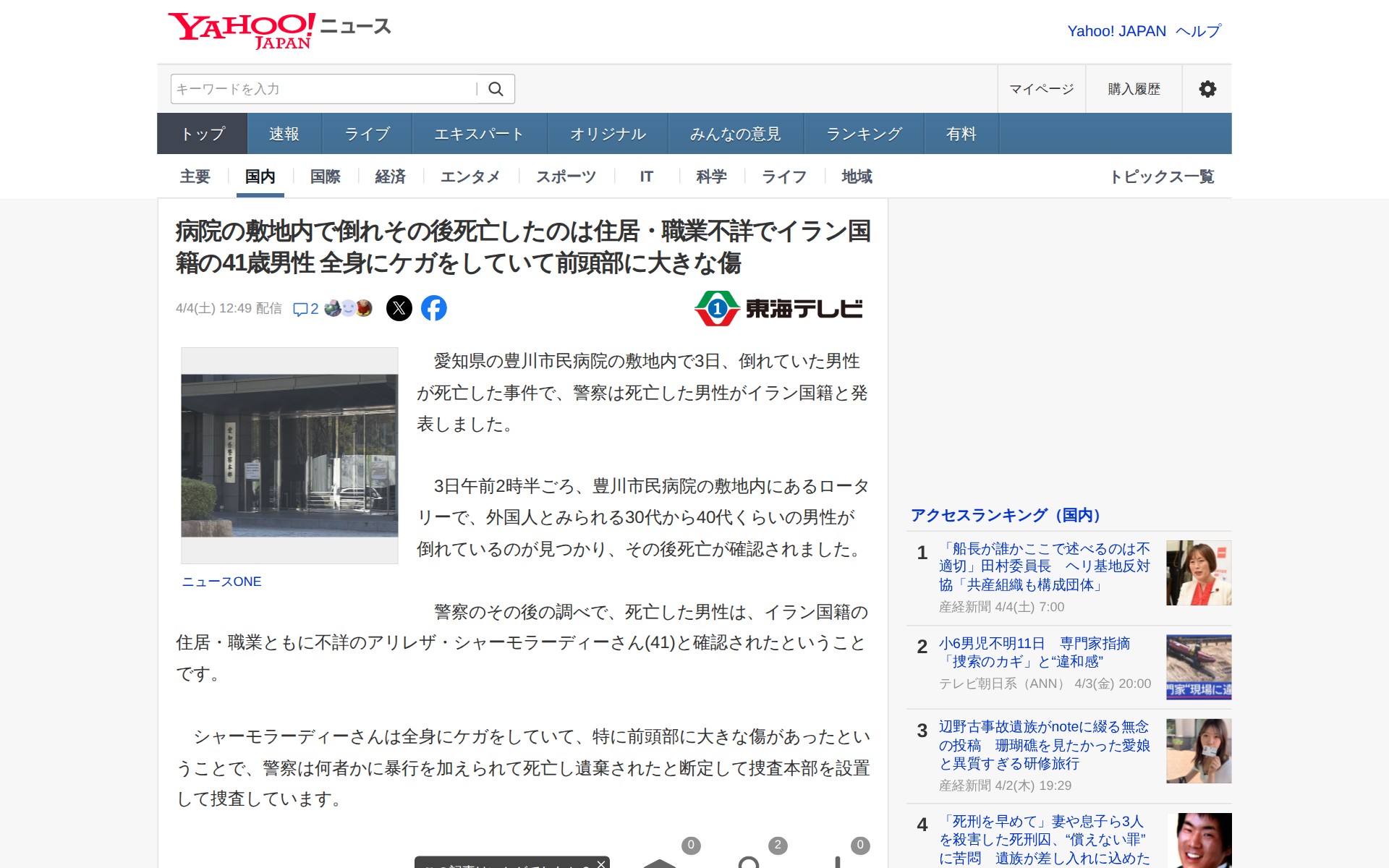このページは、愛知県豊川市民病院の敷地内で発見された男性の死亡事件を報じている。倒れていた男性はイラン国籍のアリレザ・シャーモラーディーさん(41)で、住居・職業は不詳。全身にケガがあり、特に前頭部に大きな傷があった。警察は何者かに暴行を加えられて死亡し遺棄されたと断定し、捜査本部を設置している。発見の約2時間前に、約13km離れたパーキングエリアで男性が殴られて車に乗せられるのが目撃されており、関連性が調査されている。