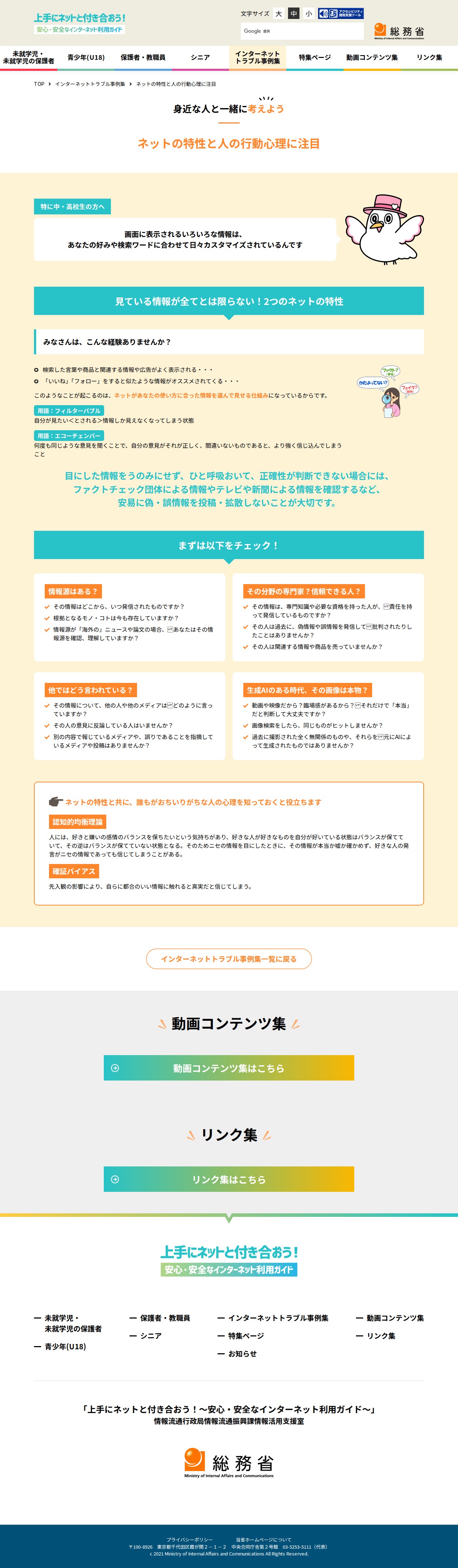テーマ1 【身近な人と一緒に考えよう】ネットの特性と人の行動心理に注目 | インターネットトラブル事例集 | 上手にネットと付き合おう! ~安心・安全なインターネット利用ガイド~ | 総務省