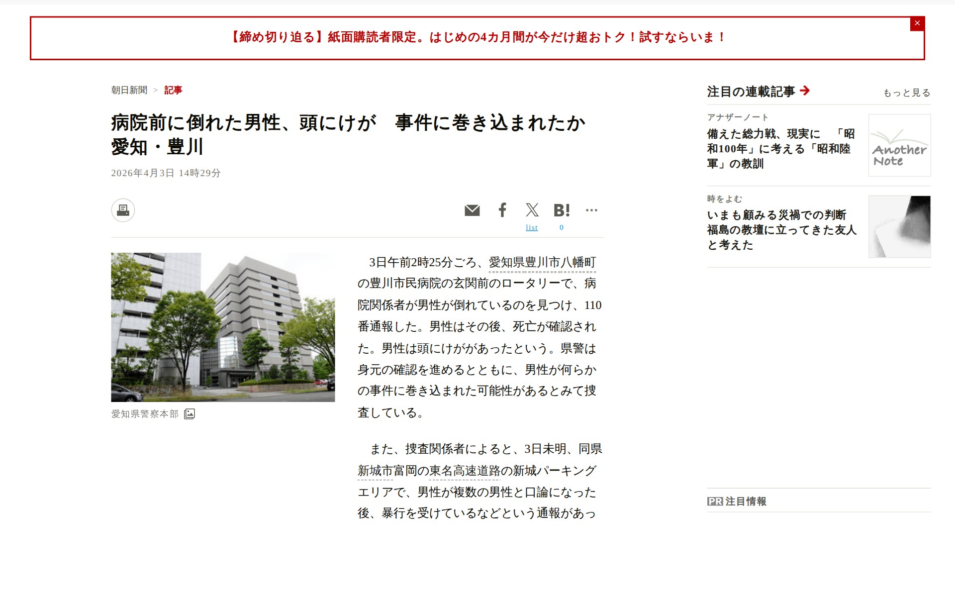 ![病院前に倒れた男性、頭にけが 事件に巻き込まれたか 愛知・豊川 [愛知県]:朝日新聞 - 保存されたスクリーンショット](https://pub-f6fa8ca7bebe4069bff3224f9a8f5334.r2.dev