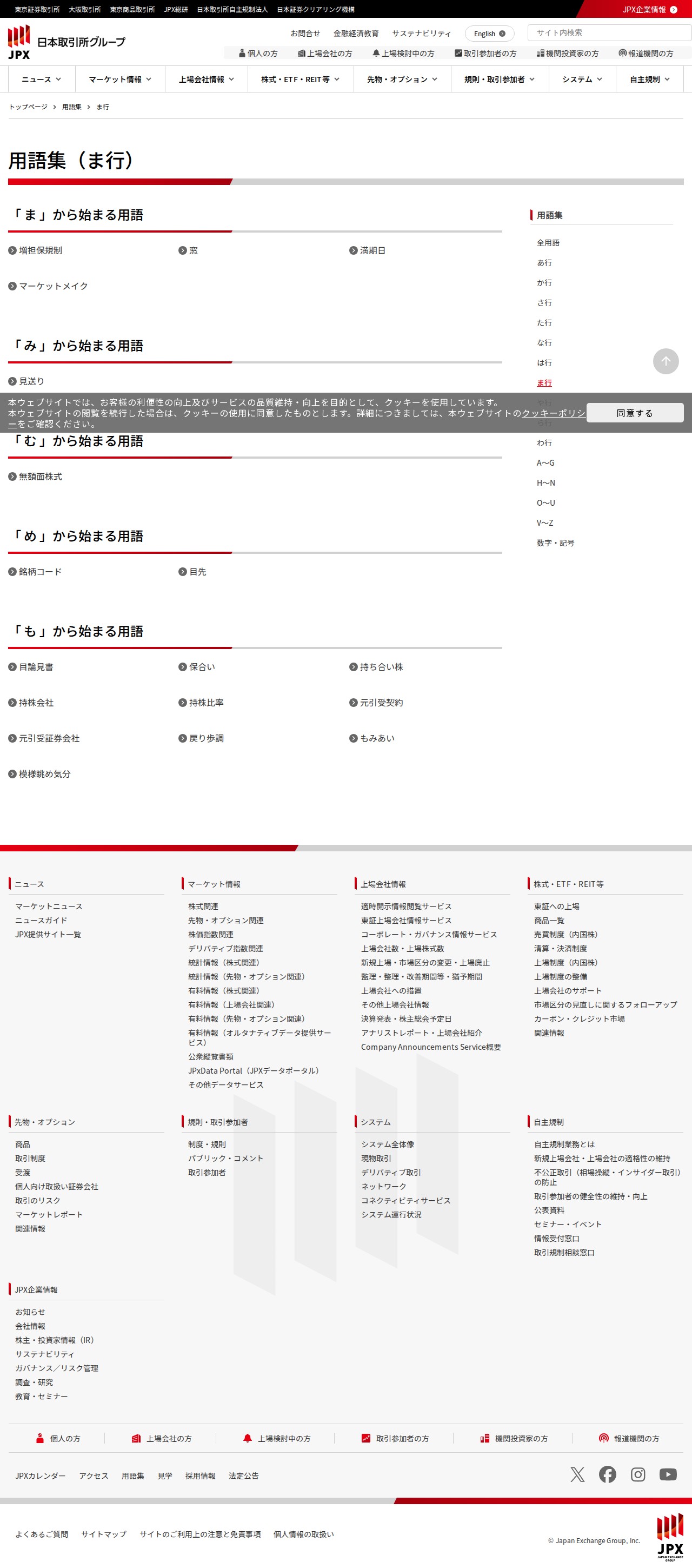 このページは、日本取引所グループの用語集のま行に掲載されている金融取引関連用語を紹介するものです。増担保規制、窓、満期日、マーケットメイク、見送り、無額面株式、銘柄コード、目先、目論見書、保合い、持ち合い株、持株会社、持株比率、元引受契約、元引受証券会社、戻り歩調、もみあい、模様眺め気分など、株式や先物・オプション取引に関する専門用語が掲載されています。