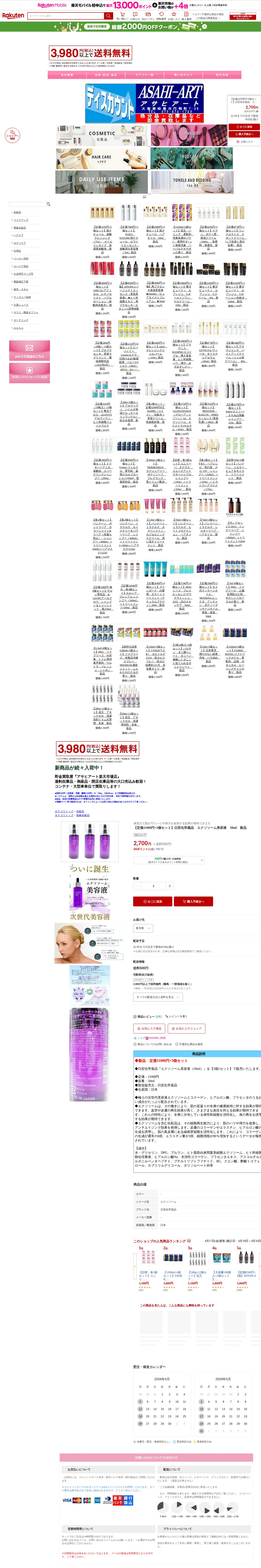 このページは、楽天市場のアサヒアート楽天市場店で販売されている日宏化学薬品のエクソソーム美容液(50ml)の3個セット商品ページです。定価11000円×3個セットが2,700円で販売されており、送料は500円です。11時までの注文で最短4月19日の配送が可能です。ページには関連商品として、肌ナチュール製品やその他の美容液、クリーム、シャンプーなど様々なスキンケア・ヘアケア商品が複数掲載されています。