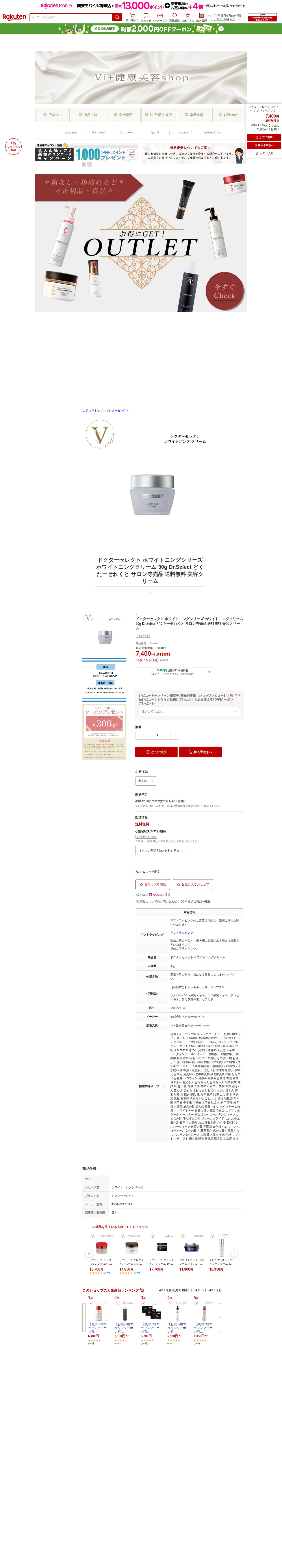 このページは、楽天市場で販売されているドクターセレクト ホワイトニングシリーズのホワイトニングクリーム30gの商品ページです。価格は7,400円で送料無料。有効成分としてトラネキサム酸とアルブチンを含み、シルバーバイン果実エキスなどの植物成分も配合されています。サロン専売品の美容クリームで、適量を気になる部分になじませて使用します。レビュー投稿で次回使える300円クーポンがもらえるキャンペーン開催中。