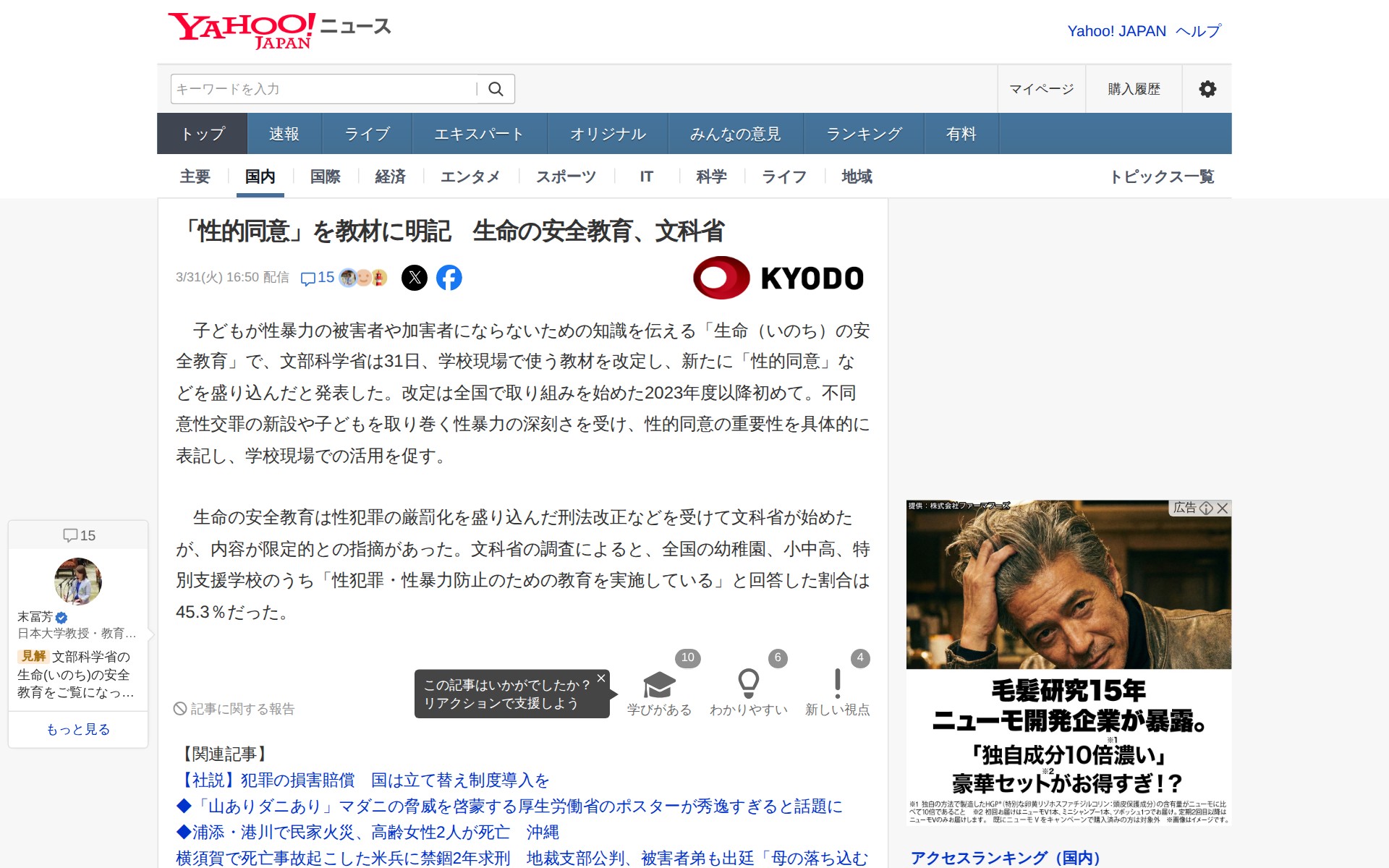 「性的同意」を教材に明記 生命の安全教育、文科省(共同通信) - Yahoo!ニュース - 保存されたスクリーンショット