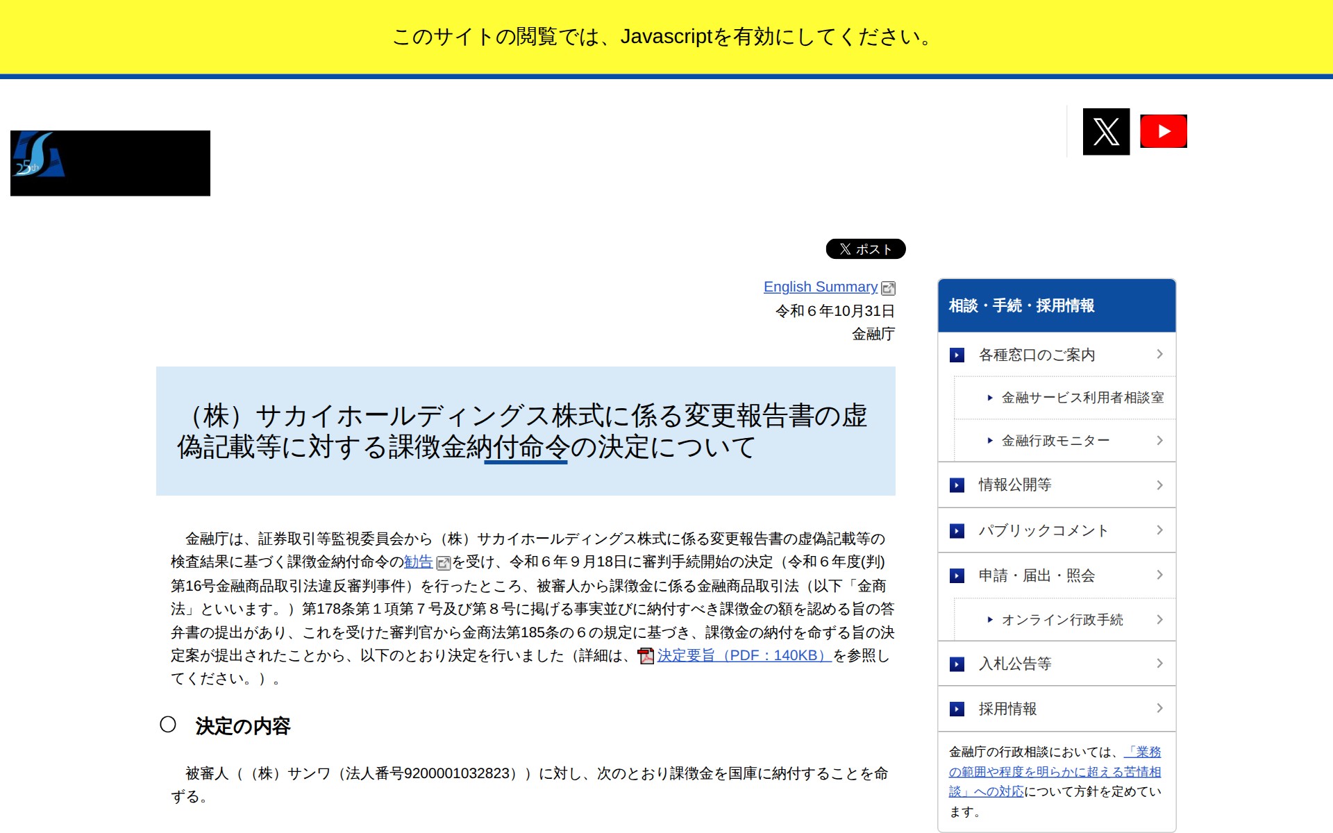 このページは、金融庁が株式会社サカイホールディングスの変更報告書における虚偽記載等に対する課徴金納付命令を決定したことを発表したものである。証券取引等監視委員会の検査結果に基づき、2024年9月18日に審判手続開始の決定がなされた。被審人が金融商品取引法違反を認める答弁書を提出したため、審判官の決定案に基づき課徴金納付命令が決定された。納付対象は株式会社サンワで、納付額は10万円、納付期限は2025年1月6日である。