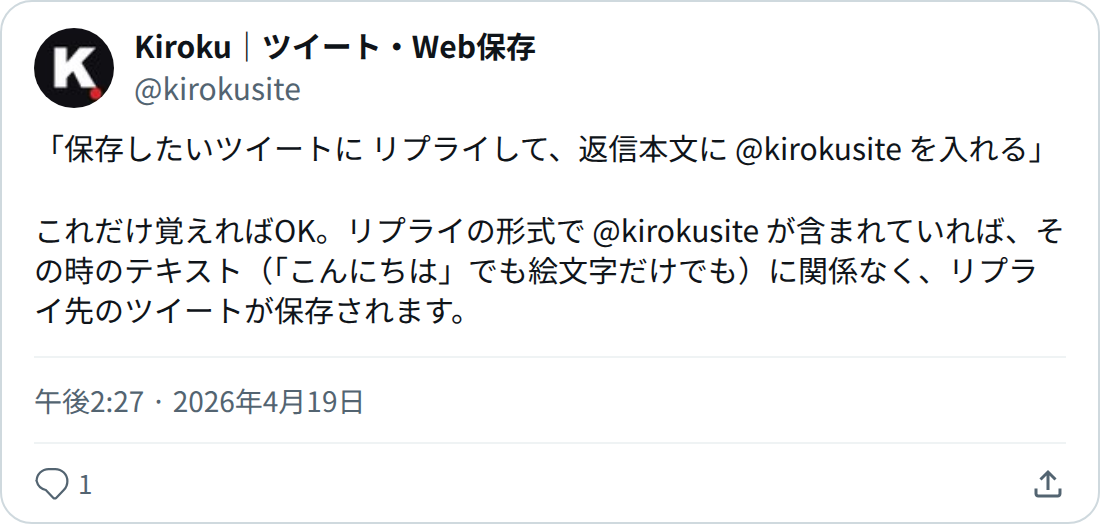 「保存したいツイートに リプライして、返信本文に @kirokusite を入れる」 これだけ覚えればOK。リプライの形式で @kirokusite が含まれていれば、その時のテキスト(「こんにちは」でも絵文字だけでも)に関係なく、リプライ先のツイートが保存されます。