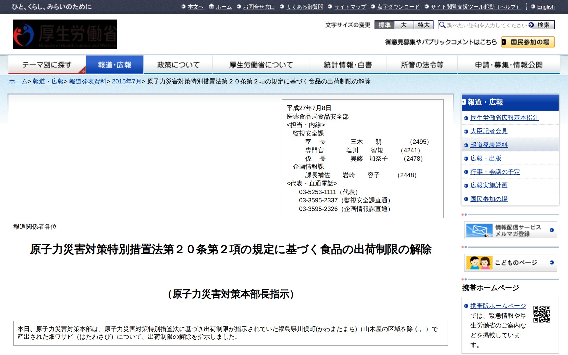 原子力災害対策特別措置法第20条第2項の規定に基づく食品の出荷制限の解除 |報道発表資料|厚生労働省