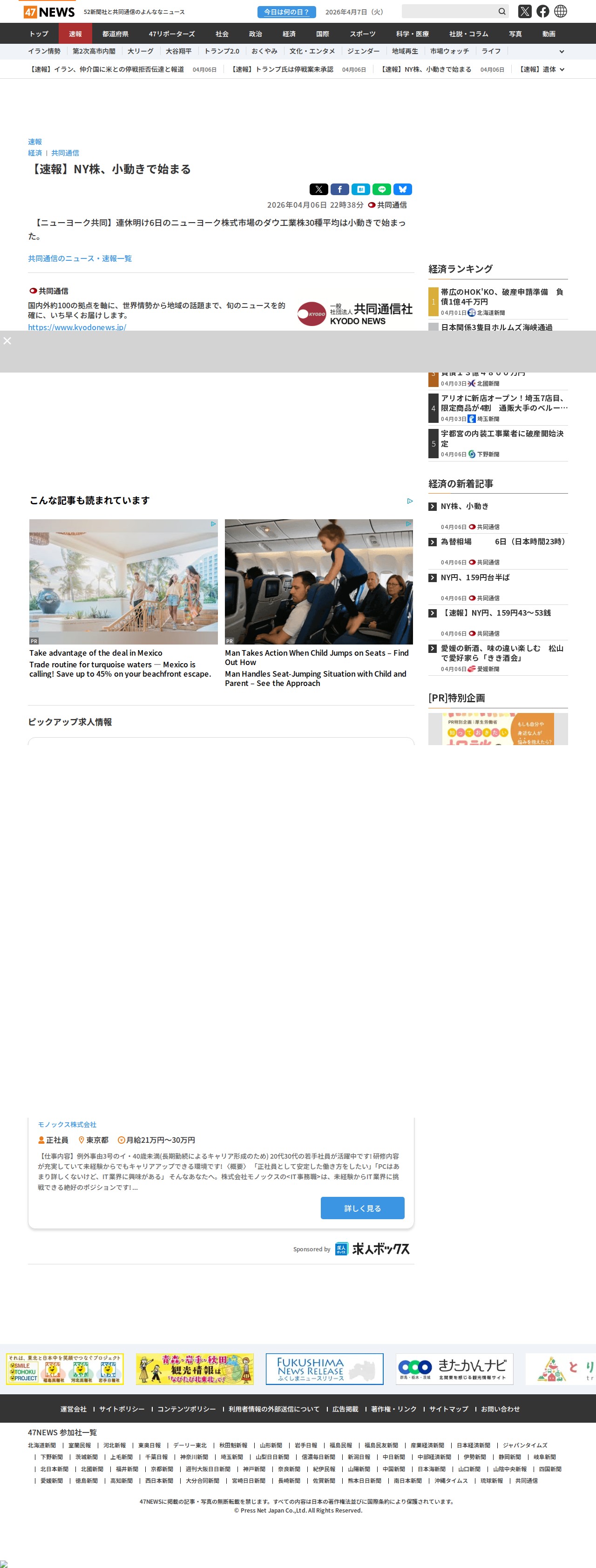 このページは、2026年4月6日のニューヨーク株式市場の取引開始時の様子を伝える速報記事です。連休明けのニューヨーク株式市場でダウ工業株30種平均が小動きで始まったことを報じています。記事は共同通信による配信で、国内外約100の拠点から世界情勢から地域ニュースまで幅広い情報を提供するニュースサイト47NEWSに掲載されています。