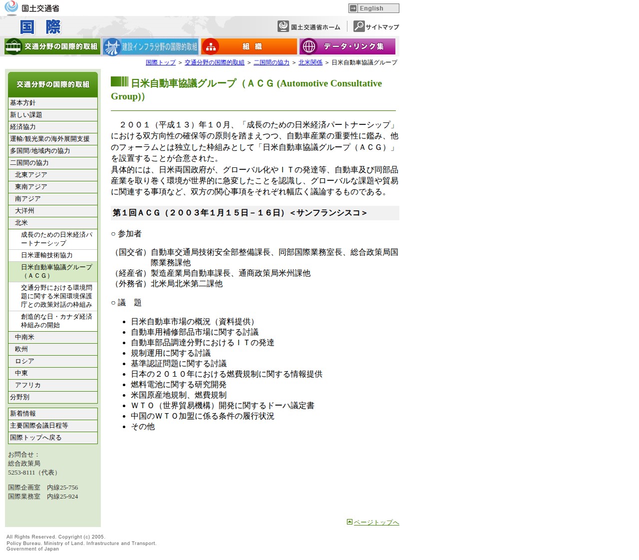 このページは、2001年10月に設置された日米自動車協議グループ(ACG)について説明しています。グローバル化やIT発達により自動車産業の環境が急速に変化する中、日米両国政府が独立した協力枠組みとして設立しました。グローバルな課題や貿易関連事項など双方の関心事項を幅広く議論するものです。2003年1月のサンフランシスコでの第1回会合では、自動車市場概況、補修部品市場、IT活用、規制運用、燃費規制、燃料電池研究開発など多岐にわたる議題が取り扱われました。