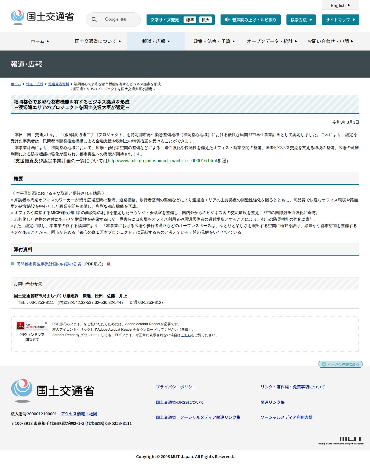 報道発表資料:福岡都心で多彩な都市機能を有するビジネス拠点を形成 <br>~渡辺通エリアのプロジェクトを国土交通大臣が認定~ - 国土交通省