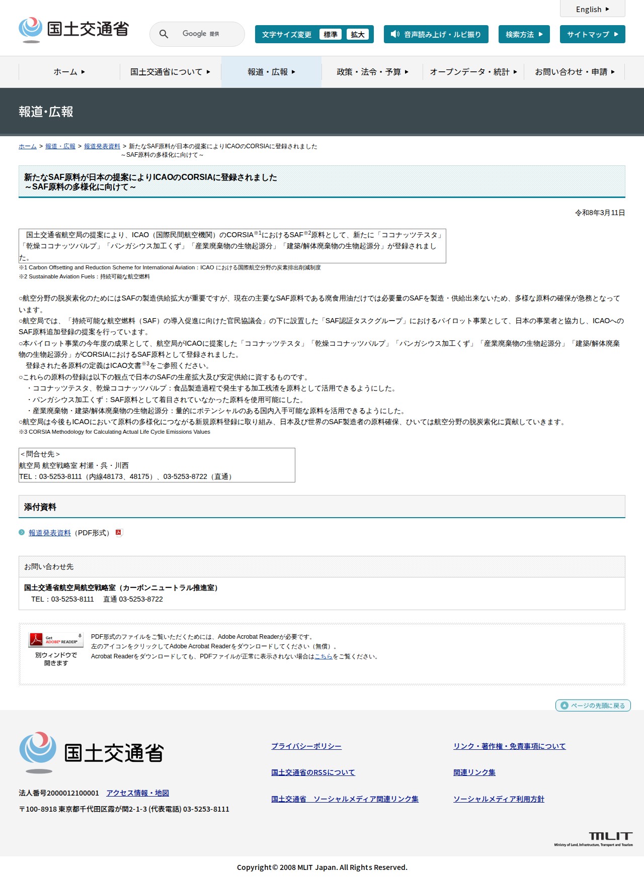 報道発表資料:新たなSAF原料が日本の提案によりICAOのCORSIAに登録されました<br>~SAF原料の多様化に向けて~ - 国土交通省